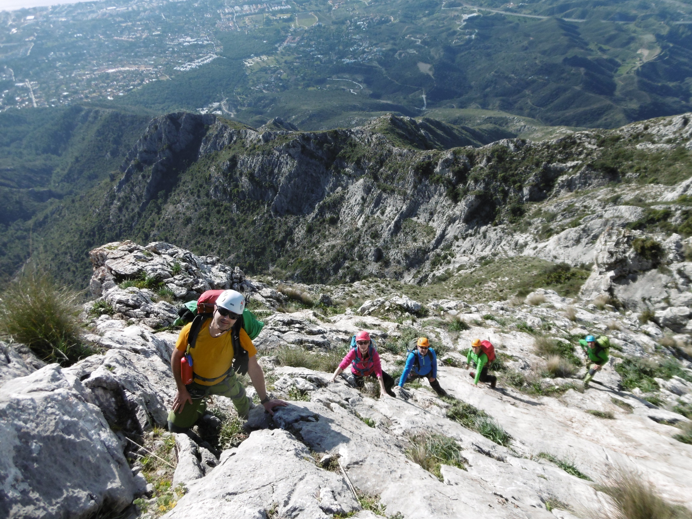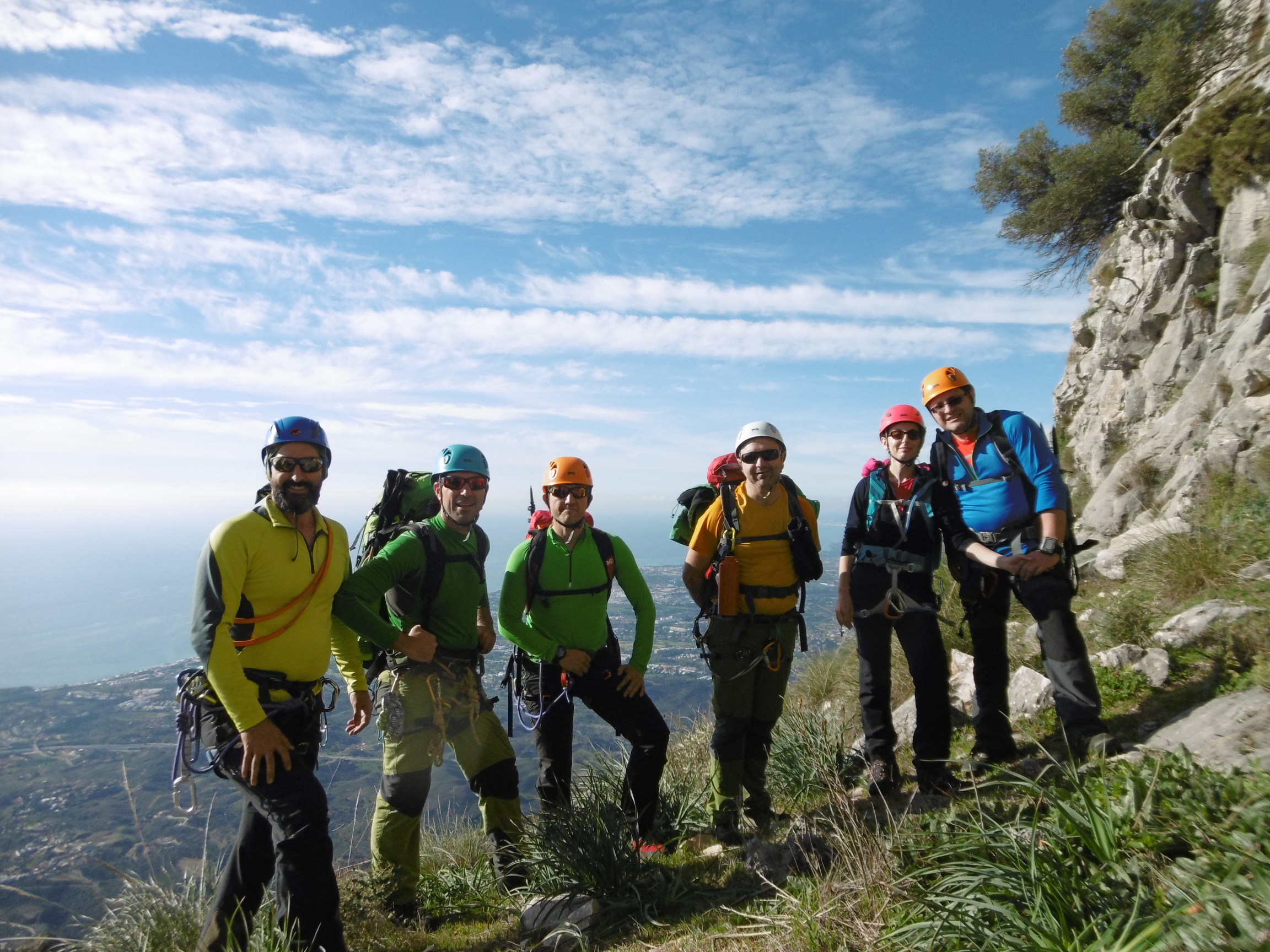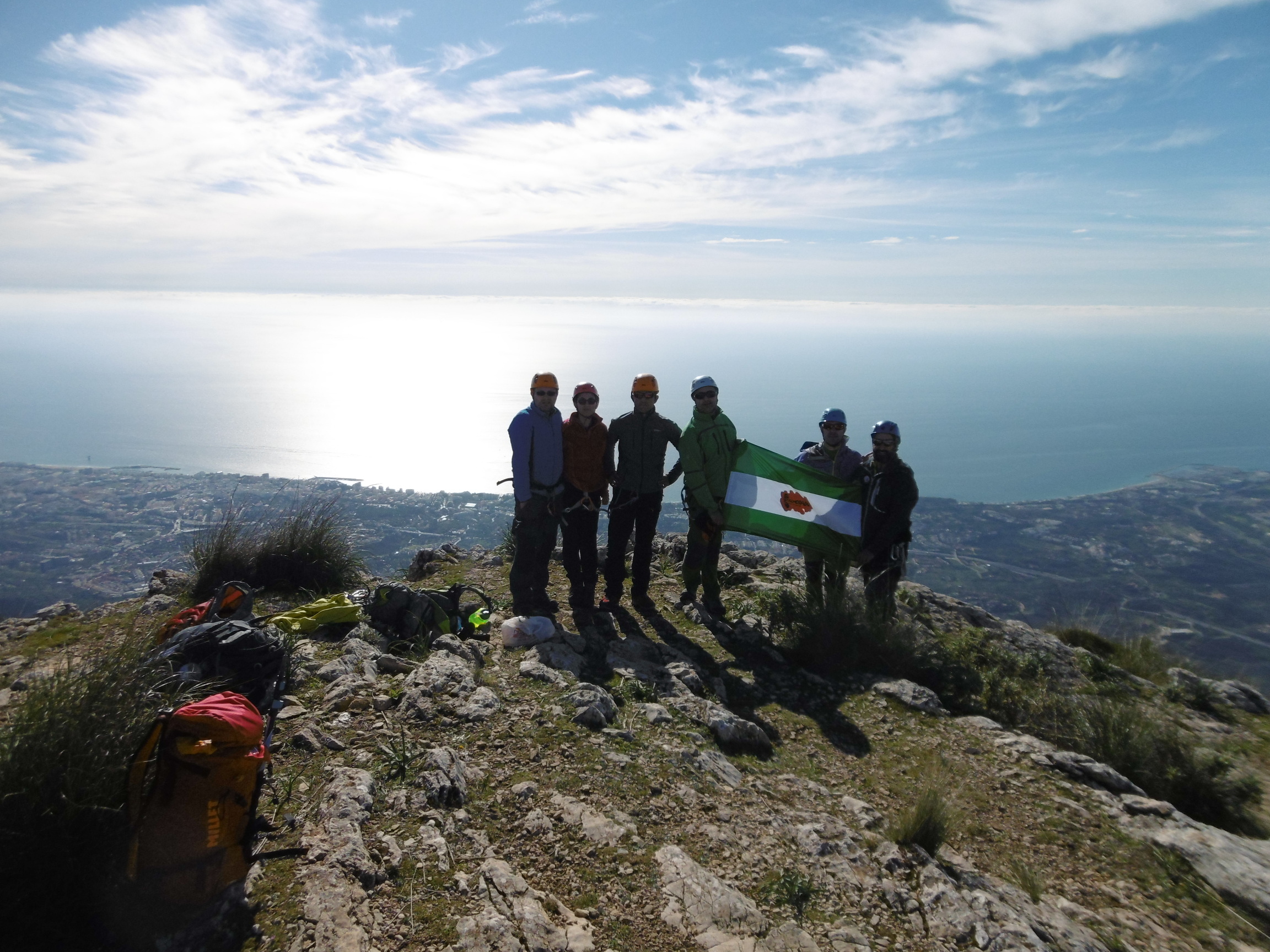 Nos reunimos temprano, y ya sobre las 7:30 h. estábamos comenzando la subida, comenzamos en el pinar de Nagüeles con los frontales puestos. Poco a poco vamos ganando altura primero atravesando una pista, para poco después pasar ya a una senda que nos lleva hasta la mina de Buenavista. Una vez atravesada la zona de la mina, dejamos la senda y comenzamos a adentrarnos en el arroyo, donde poco a poco avanzamos hasta llegar a una ramificación del arroyo, donde nosotros nos desviaremos hacia la izquierda, adentrándonos en un barranco, donde hacemos la primera parada para tomar algo y beber, nos colocamos los árneses y los cascos, y continuamos la ruta remontando el barranco donde cada vez se hace más notable la inclinación que vamos tomando, remontando paredes de 3 a 5 metros, pequeñas zonas algo más llanas y más trepadas. Llegamos a una zona algo más inclinada donde nos aseguramos utilizando algunas chapas que existen. Tras remontar esta zona, llegamos a los tajos de la Concha, segunda parada para tomar algo ligero y beber, y continuamos hacia la izquierda rodeando los tajos y atravesando un pasamanos donde también nos aseguramos ya que la calidad de la cuerda que tiene no nos daba suficiente confianza. Y ya tras finalizar esta zona, nos queda la parte final del recorrido, ya con unas vistas espectaculares y con algunas trepadas más, llegando finalmente a la arista final. Tras remontar la arista por fin llegamos a la Cima y la primera parte del objetivo finalizado.
