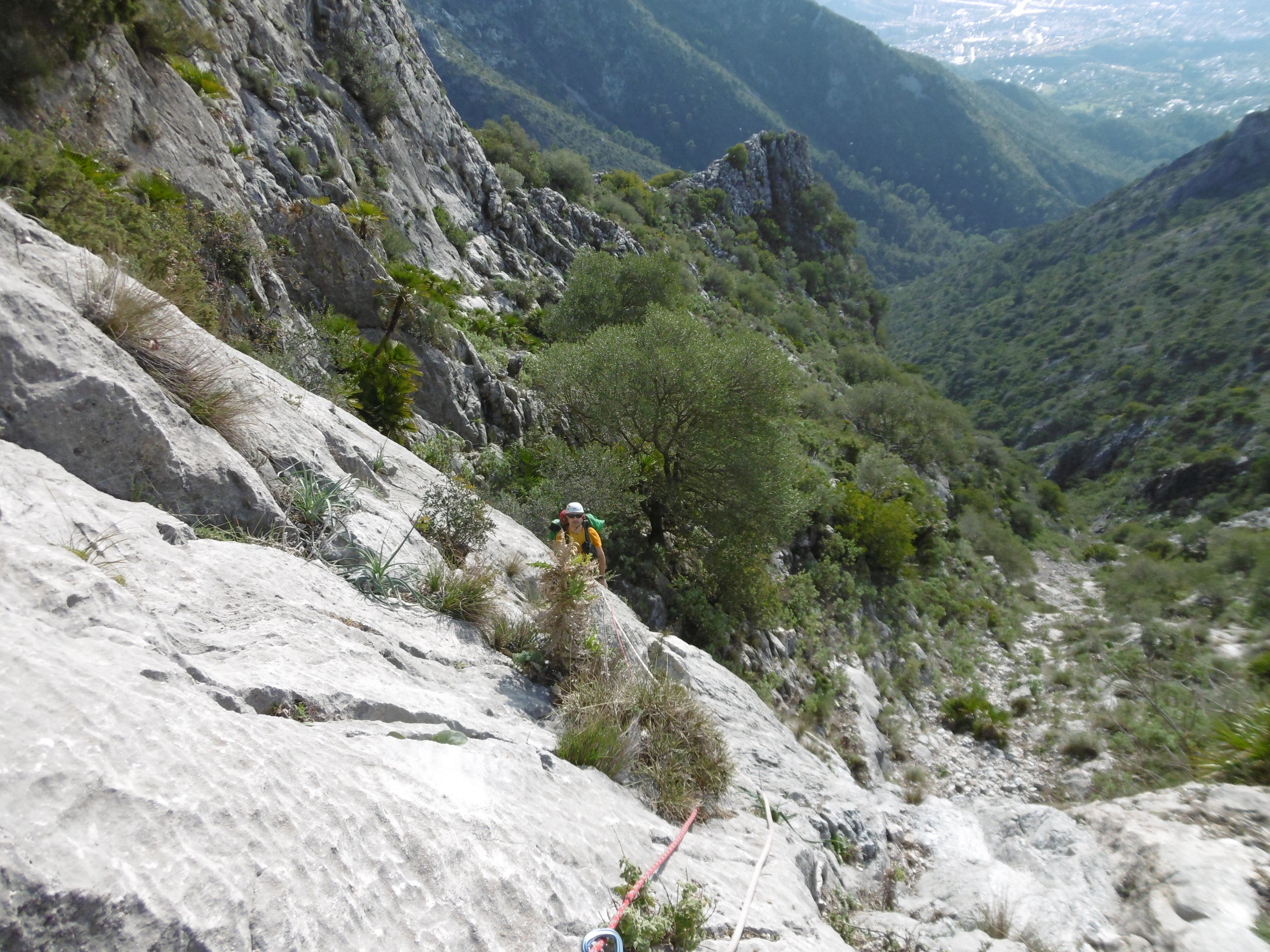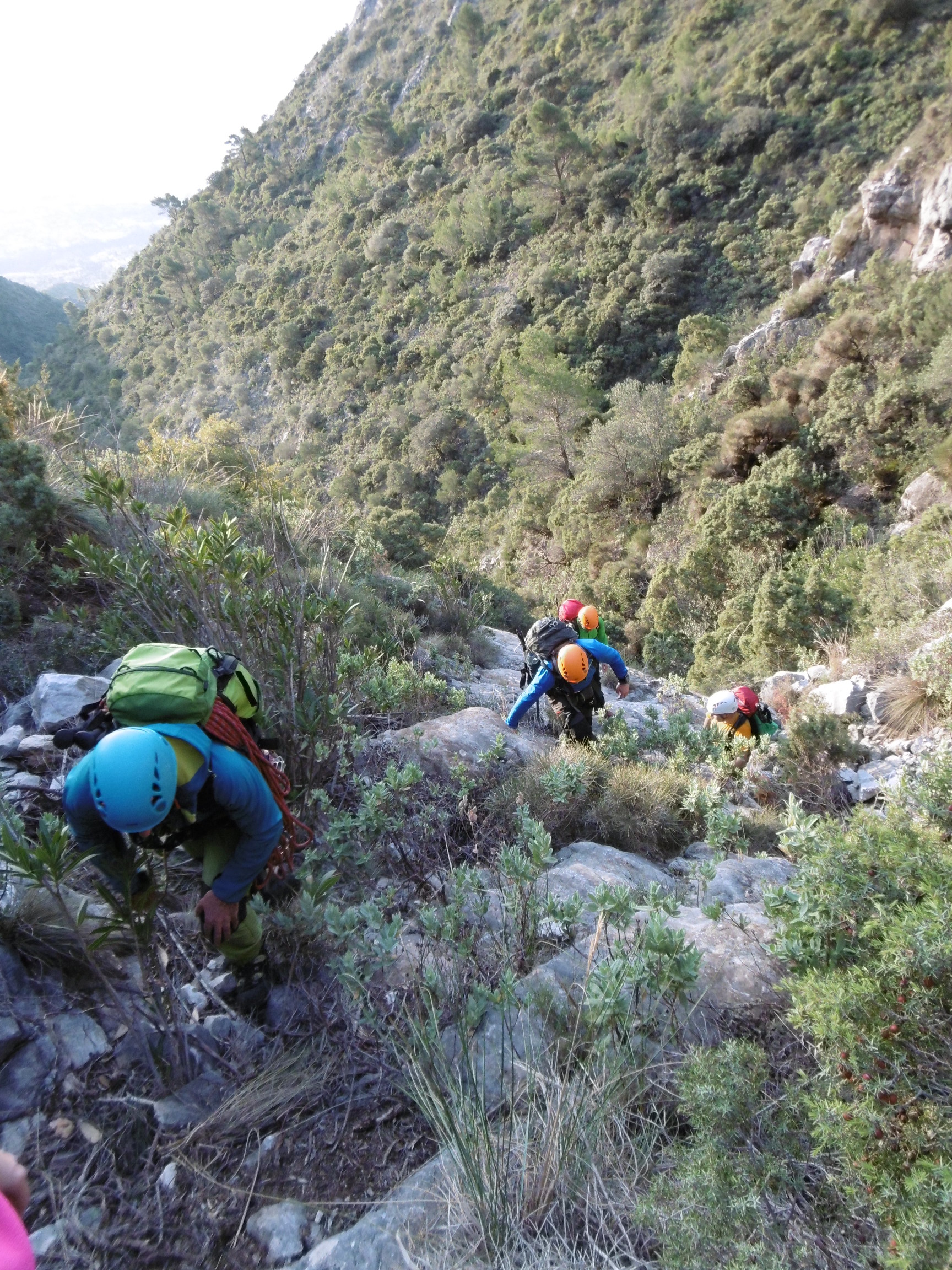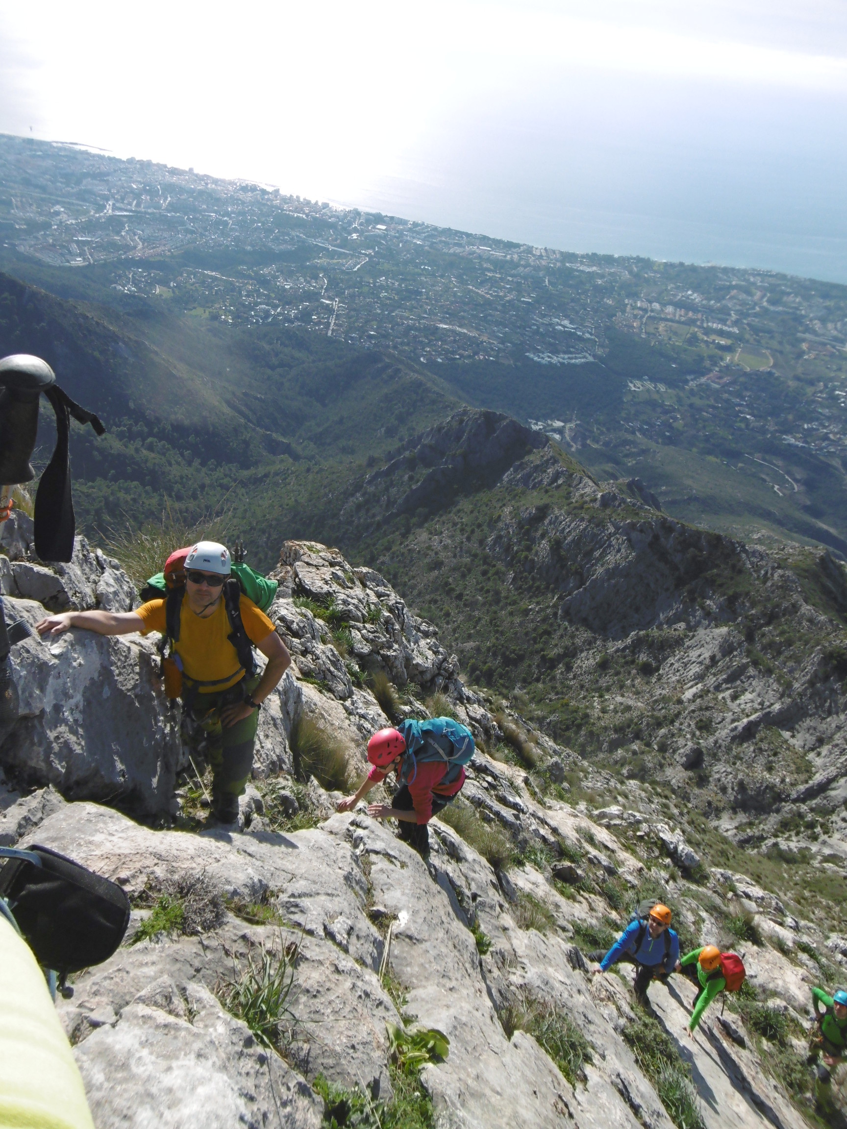 Nos reunimos temprano, y ya sobre las 7:30 h. estábamos comenzando la subida, comenzamos en el pinar de Nagüeles con los frontales puestos. Poco a poco vamos ganando altura primero atravesando una pista, para poco después pasar ya a una senda que nos lleva hasta la mina de Buenavista. Una vez atravesada la zona de la mina, dejamos la senda y comenzamos a adentrarnos en el arroyo, donde poco a poco avanzamos hasta llegar a una ramificación del arroyo, donde nosotros nos desviaremos hacia la izquierda, adentrándonos en un barranco, donde hacemos la primera parada para tomar algo y beber, nos colocamos los árneses y los cascos, y continuamos la ruta remontando el barranco donde cada vez se hace más notable la inclinación que vamos tomando, remontando paredes de 3 a 5 metros, pequeñas zonas algo más llanas y más trepadas. Llegamos a una zona algo más inclinada donde nos aseguramos utilizando algunas chapas que existen. Tras remontar esta zona, llegamos a los tajos de la Concha, segunda parada para tomar algo ligero y beber, y continuamos hacia la izquierda rodeando los tajos y atravesando un pasamanos donde también nos aseguramos ya que la calidad de la cuerda que tiene no nos daba suficiente confianza. Y ya tras finalizar esta zona, nos queda la parte final del recorrido, ya con unas vistas espectaculares y con algunas trepadas más, llegando finalmente a la arista final. Tras remontar la arista por fin llegamos a la Cima y la primera parte del objetivo finalizado.