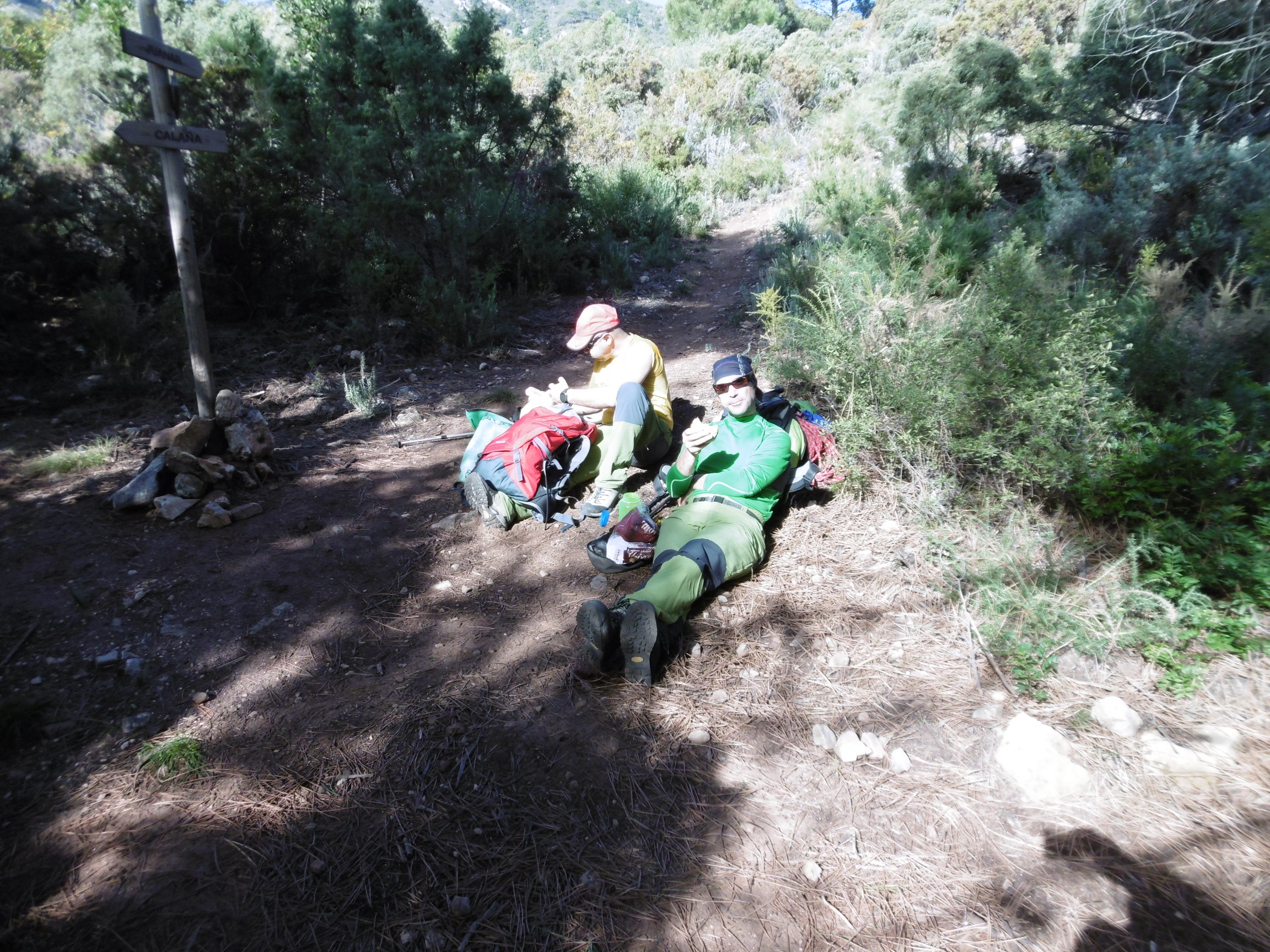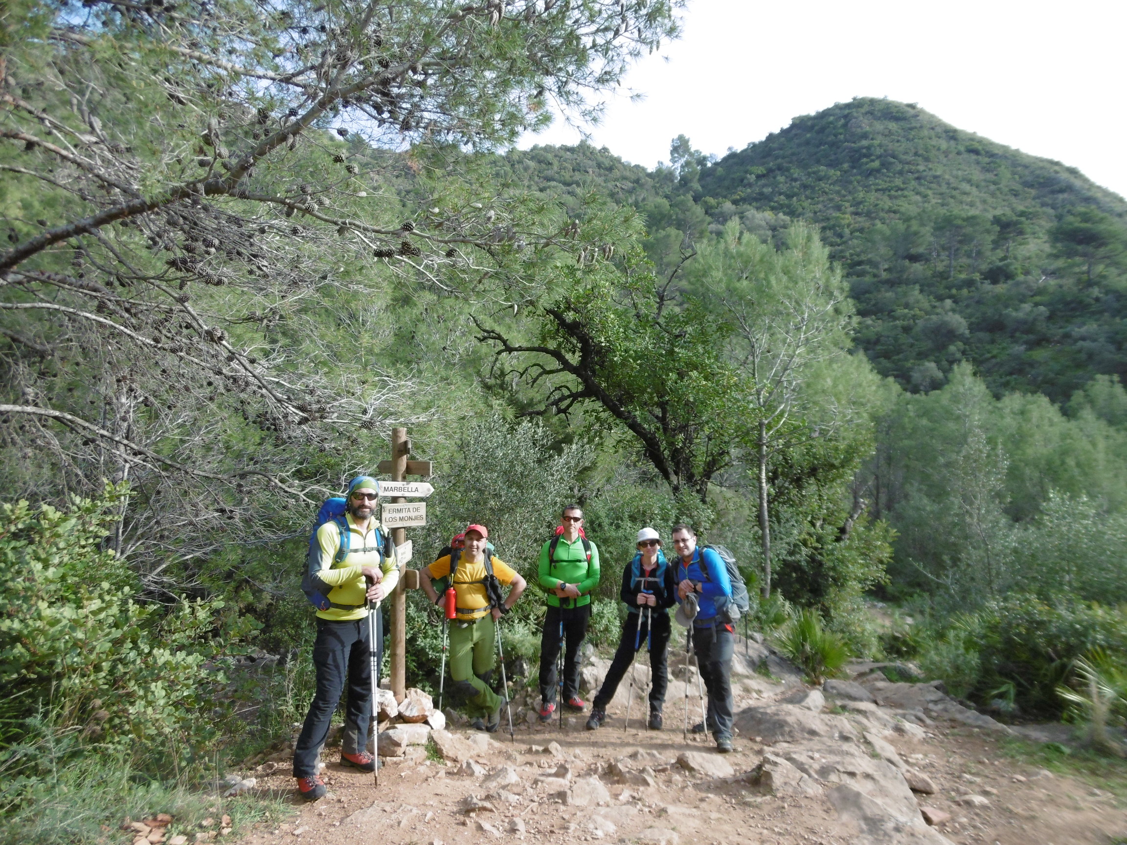Tras la foto de rigor, comenzamos el regreso por la senda que lleva hacia el Refugio de Juanar, la senda típica que en un día tan espectacular como el que nos hizo estaba completamente llena de gente. Pasamos primeramente por la arista, después bajo el Cerro Lastonar, llegando al Salto del Lobo y después al Puerto de las Allanas, justo en este punto una breve parada para beber y desviarnos por la senda que sale del puerto hacia la derecha en dirección Marbella, esta senda pasa justo por debajo de la Cruz de Juanar y llega al Puerto de Juan Benítez, continuando hacia la derecha en dirección al Balcón del Pino, continuando la senda hasta el cruce con la senda de la Calaña, donde nos detuvimos a comer. Terminada la comida continuamos la ruta bajando hacia el arroyo de las Carihuelas en la zona cercana a la fuente de la Calaña, una vez en el arroyo comenzamos a descenderlo hasta la ermita de los Monjes, donde nos desviamos tomando la senda que lleva hasta Nagüeles.