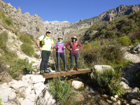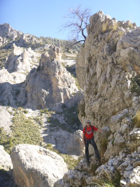 Después de ese ajetreado despertar, pusimos rumbo hacia Bélmez de la Moraleda, nuestro pueblo de referencia, que se encuentra casi al pie del barranco del río Gargantón, por el que íbamos a subir. Paramos a desayunar en una venta justo al pasar Granada, y llegamos al pueblo alrededor de las 9 de la mañana, buena hora para empezar a andar. allí cogimos la pista del río Gargantón, la cual figura en google maps, por lo cual este inicio de ruta es muy fácil de encontrar. Dejamos el coche en un cruce justo al pasar el puente sobre el río, y comenzamos a andar por un sendero junto al río, el cual vadeamos varias veces por unos puntes de madera, y otras por donde pudimos, y fuimos remontando el barranco, el cual presenta unas formaciones de rocas realmente espectaculares, dignas de ver. Llegamos a un punto en el que el barranco se bifurca en dos, tomamos la variante de la izquierda. continuamos caminando hasta el lugar en que la ruta se convierte en circular. Seguimos hacia la derecha, en dirección hacia la Fuentezuela, un pilón en el que nos refrescamos y recargamos agua, pues el día, a pesar de la fecha, era soleado y hacía un calor considerable, y yo encima me había llevado los pantalones de invierno.