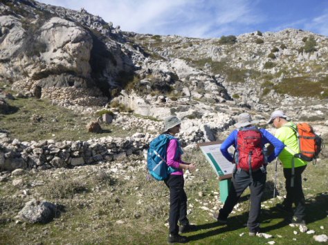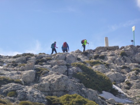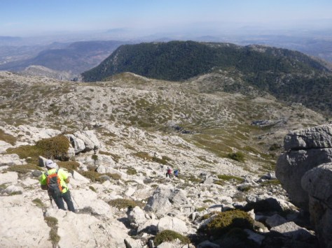Ahora empezaba la parte más dura de la ruta, una fuerte subida hacia la cuerda superior de la sierra, fuera de sendero, de unos 400m de desnivel, con terreno un poco suelto y cubierto de sabinas que hacia un poco incómodo el avanzar. Tomamos como referencia un gran árbol y nos fuimos dirigiendo hacia él cada uno a su paso. Alguno llegó maldiciendo al guía, jeje. Ya estábamos en la cuerda superior, rondando los 2000m, ahora tocaba seguir la cresta durante un par de horas cruzando toda la cresta cimera de la sierra, hasta el pico mágina. A medio camino nos encontramos con el refugio de miramundo, el cual pude gratamente comprobar que ha sido restaurado recientemente, pues la última vez que que estuve hace tres años estaba ruinoso y con riesgo de derrumbe del techo. Ahora lo han dejado perfecto, todo restaurado con ventanas y puertas nuevas, algunas sillas, mesa, una caja con primeros auxilios, libros, y la parte superior acondicionada como dormitorio. Hicimos una parada para el bocata, descansar un poco, y volver a ponernos en marcha con más energía.