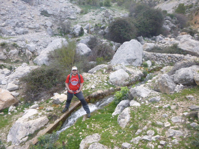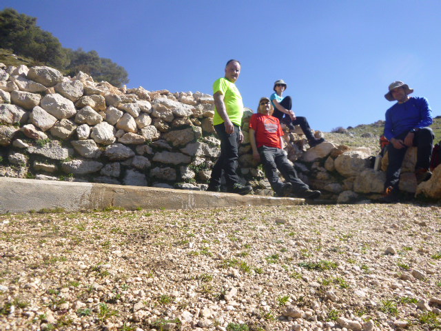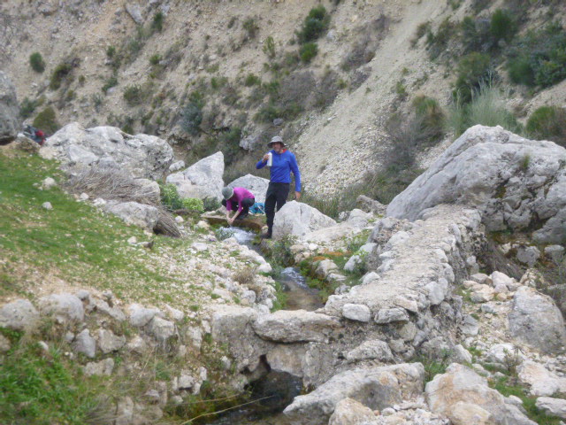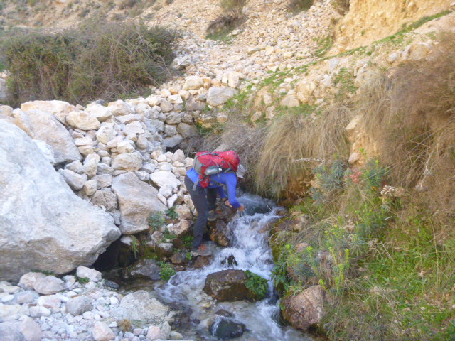 Después de ese ajetreado despertar, pusimos rumbo hacia Bélmez de la Moraleda, nuestro pueblo de referencia, que se encuentra casi al pie del barranco del río Gargantón, por el que íbamos a subir. Paramos a desayunar en una venta justo al pasar Granada, y llegamos al pueblo alrededor de las 9 de la mañana, buena hora para empezar a andar. allí cogimos la pista del río Gargantón, la cual figura en google maps, por lo cual este inicio de ruta es muy fácil de encontrar. Dejamos el coche en un cruce justo al pasar el puente sobre el río, y comenzamos a andar por un sendero junto al río, el cual vadeamos varias veces por unos puntes de madera, y otras por donde pudimos, y fuimos remontando el barranco, el cual presenta unas formaciones de rocas realmente espectaculares, dignas de ver. Llegamos a un punto en el que el barranco se bifurca en dos, tomamos la variante de la izquierda. continuamos caminando hasta el lugar en que la ruta se convierte en circular. Seguimos hacia la derecha, en dirección hacia la Fuentezuela, un pilón en el que nos refrescamos y recargamos agua, pues el día, a pesar de la fecha, era soleado y hacía un calor considerable, y yo encima me había llevado los pantalones de invierno.