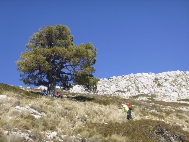 Bajamos por la cara sur, siguiendo mas o menos lo que sería la ruta tradicional, señalizada. La bajada se hizo bastante dura, el terreno estaba bastante suelto y pedregoso, lo que la hizo muy incómoda y larga, pero atravesamos un espectacular bosque de pinos centenarios que la amenizaron y hicieron de broche final a una ruta que no tiene desperdicio, tanto la subida con esas formaciones en el barranco, la cresta con sus vistas y el refugio, y la bajada a través de ese bosque espectacular.