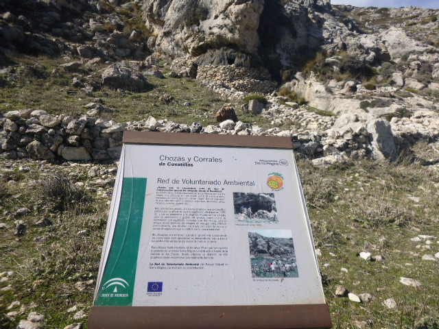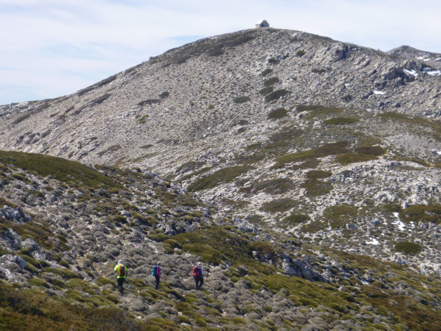 Ahora empezaba la parte más dura de la ruta, una fuerte subida hacia la cuerda superior de la sierra, fuera de sendero, de unos 400m de desnivel, con terreno un poco suelto y cubierto de sabinas que hacia un poco incómodo el avanzar. Tomamos como referencia un gran árbol y nos fuimos dirigiendo hacia él cada uno a su paso. Alguno llegó maldiciendo al guía, jeje. Ya estábamos en la cuerda superior, rondando los 2000m, ahora tocaba seguir la cresta durante un par de horas cruzando toda la cresta cimera de la sierra, hasta el pico mágina. A medio camino nos encontramos con el refugio de miramundo, el cual pude gratamente comprobar que ha sido restaurado recientemente, pues la última vez que que estuve hace tres años estaba ruinoso y con riesgo de derrumbe del techo. Ahora lo han dejado perfecto, todo restaurado con ventanas y puertas nuevas, algunas sillas, mesa, una caja con primeros auxilios, libros, y la parte superior acondicionada como dormitorio. Hicimos una parada para el bocata, descansar un poco, y volver a ponernos en marcha con más energía.