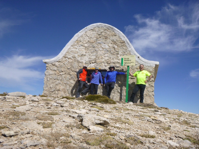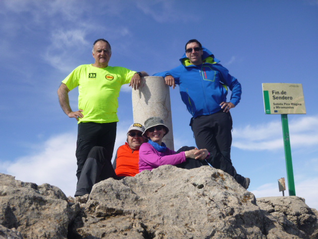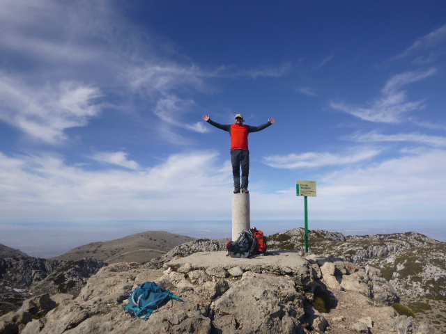Sobre las tres de la tarde llegamos al pico Mágina, no sin antes equivocarnos y creernos que era la lomita anterior que cruzamos, pues el pico Mágina desde el lado que nosotros lo abordamos, es de esos que parece que nunca llega, y lo confundes con otros piquitos que cruzas antes. Fotos de rigor, y tirando millas para abajo, que ahora si hacía un viento y un fresquito que no tenía nada que ver con el calor que habíamos pasado antes.