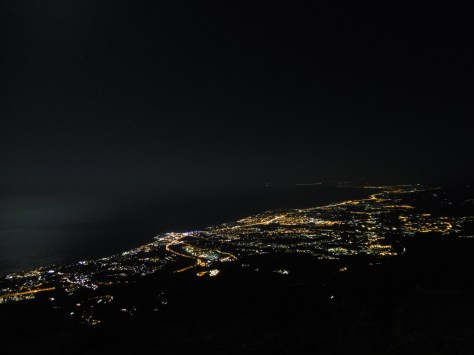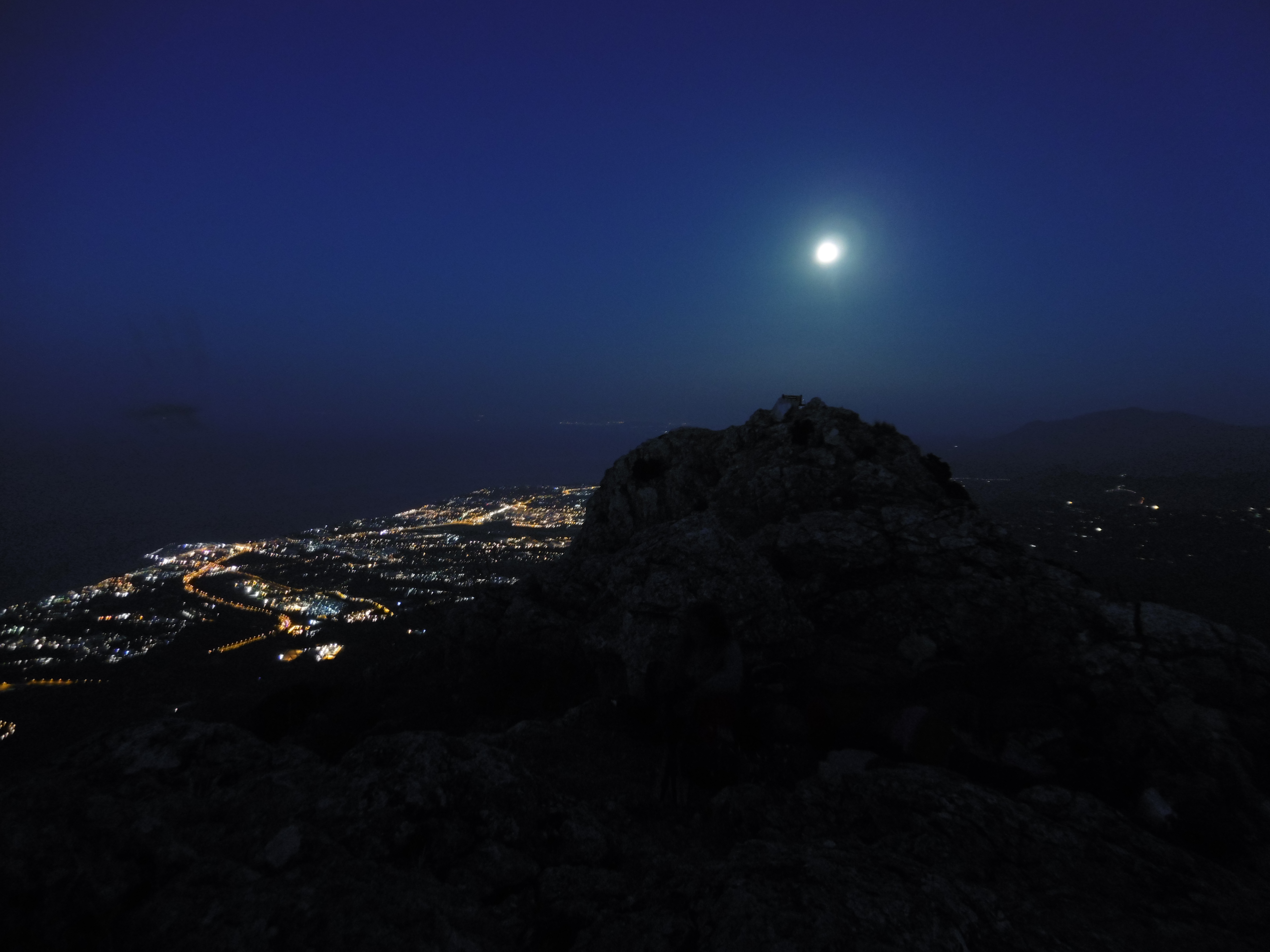 Aprovechando la luna llena de julio, hicimos una subida nocturna a la Concha de Marbella, quedamos en el parking de la Cañada y partimos en dirección al refugio de Juanar, sobre las 23:30 h. ya estabamos caminando, en poco más de 2 horas estabamos ya en la cima. Nos sentamos en el banco solidario contemplando las vistas de la costa con sus luces y con la luna.