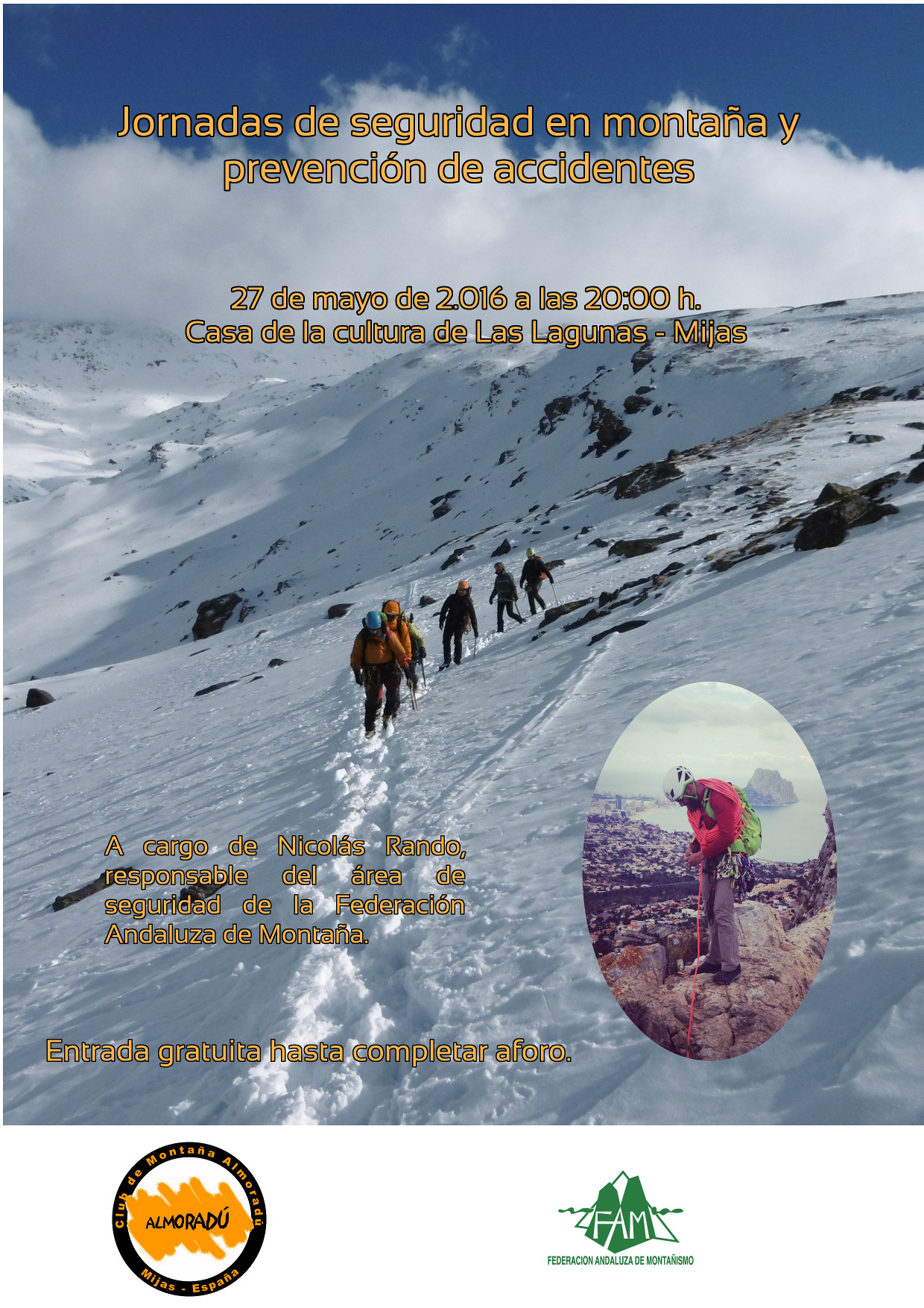 El día 27 de mayo habrá una jornada de seguridad en montaña y prevención de accidentes por parte de Nicolás Rando, responsable del área de seguridad de la Federación Andaluza de Montaña, será en la Casa de la Cultura de Las Lagunas a las 20:00 h., entrada gratuita hasta completar el aforo.