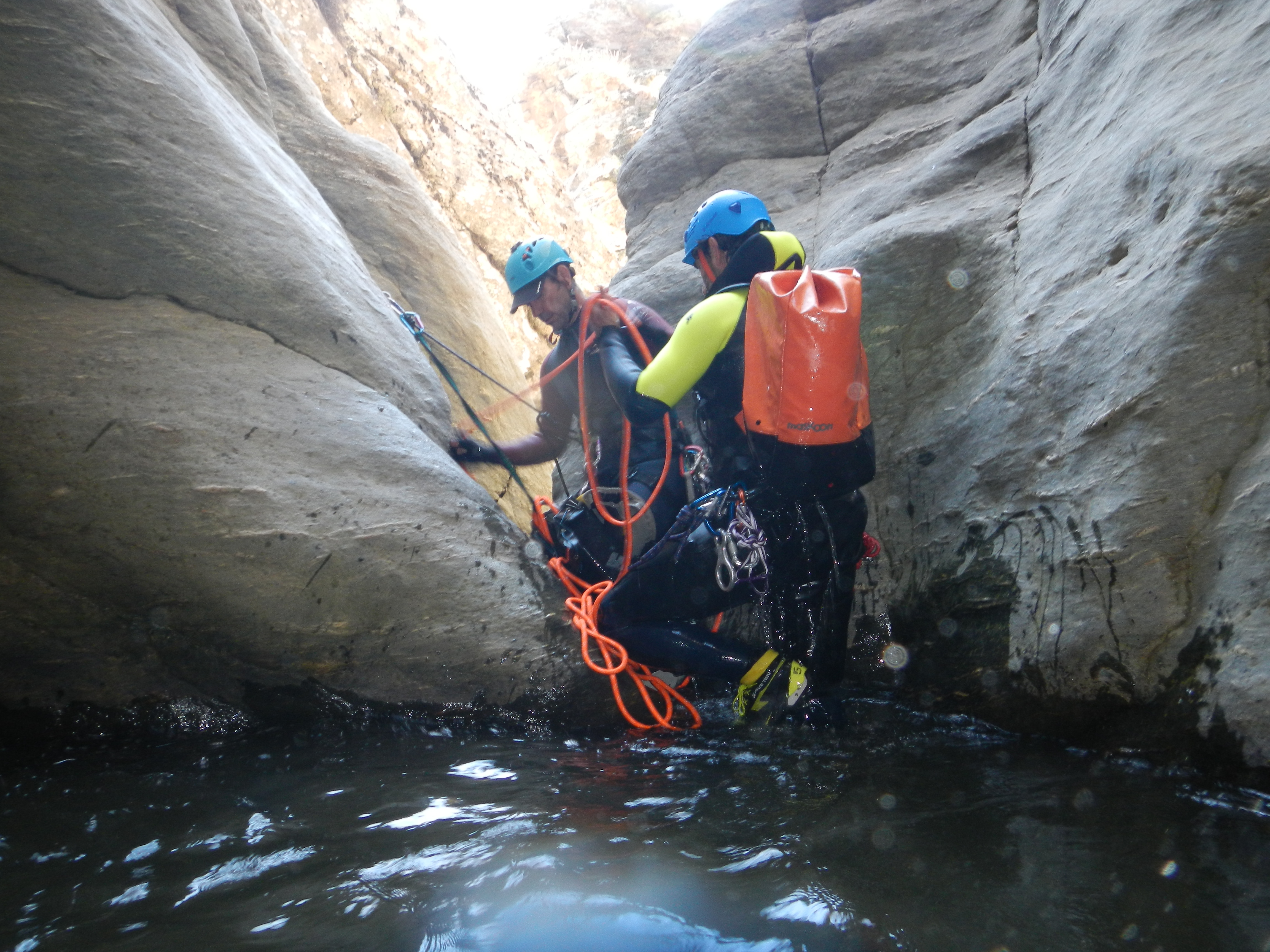 DIVERSOS RAPELES Y TOBOGANES CON ALGUNA DIFICULTAD, SOBRE TODO POR LO RESBALADIZO DEL CAUCE. CUATRO HORAS DE RECORRIDO, CONTANDO LA PROGRESIÓN ERRÓNEA.