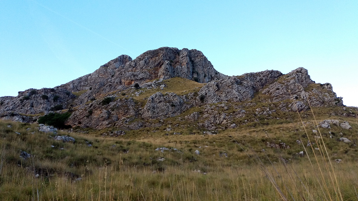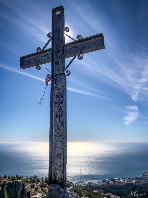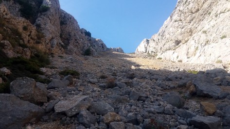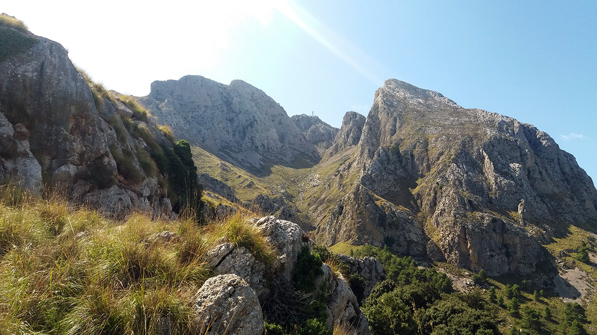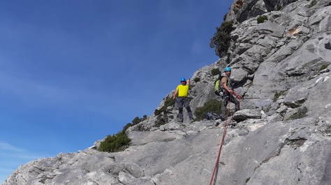 Tuvimos que madrugar para estar antes de las 8 de la mañana en el llamado Pie del Funicular – una explanada en la carretera que baja a Sa Calobra; donde en los años 20 se proyectó hacer un funicular hasta la cumbre, gracias que no se llegó a construir –. Aquí iniciamos una subida hacia el W hasta el Porxo Esbucat y podemos hacernos una idea de las tres trepadas que tenemos que hacer en la Serra Na Rius.