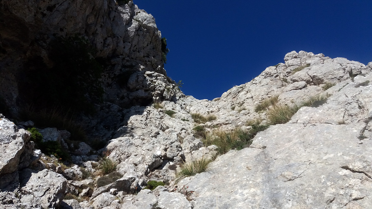 Acercándonos a la grieta del paso de Sa Pomera Borda.