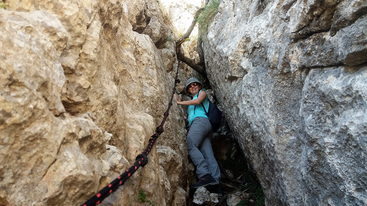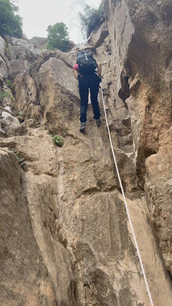 Aún nos queda una buena trepada, bastante vertical y equipada con un cable de acero. Aunque como pasó con la cuerda anterior, la piedra nos ofrece suficientes agarres.