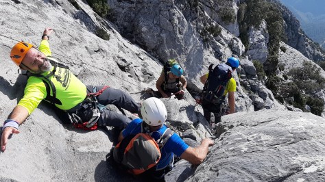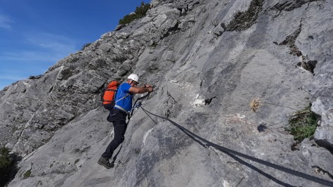 Tras pararnos un momento y disfrutar de las vistas continuamos rodeando los tajos en dirección al Paso del Cristiano, plato fuerte de la jornada, se trata de una zona más o menos inclinada y con grandes precipicios, la cual se encuentra preparada con linea de vida, que utilizamos para progresar con seguridad.