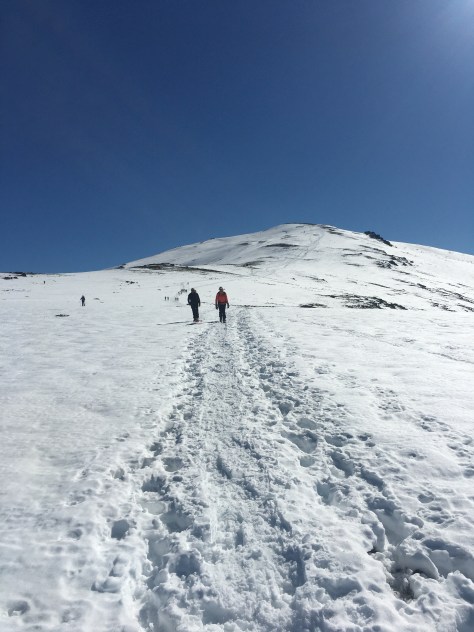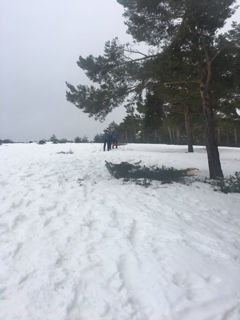 Tras preparar el material, comenzamos el ascenso por una primera rampa donde comprobamos que la nieve iba a estar bastante blanda. Tras superar esta primera rampa, continuamos el recorrido subiendo y bajando unas laderas suaves y finalmente llegar a la última rampa que lleva hasta la cima, desde allí algunas vistas, pero el día estaba bastante nuboso y con niebla.
