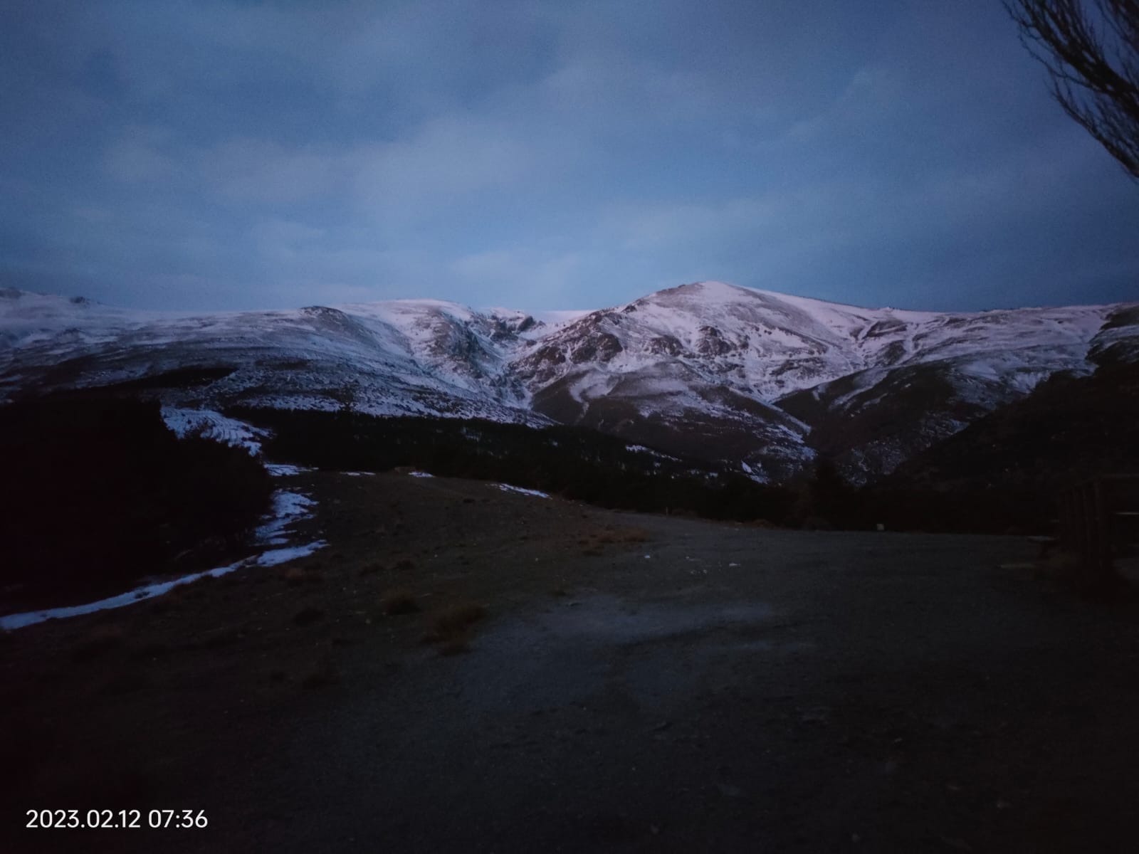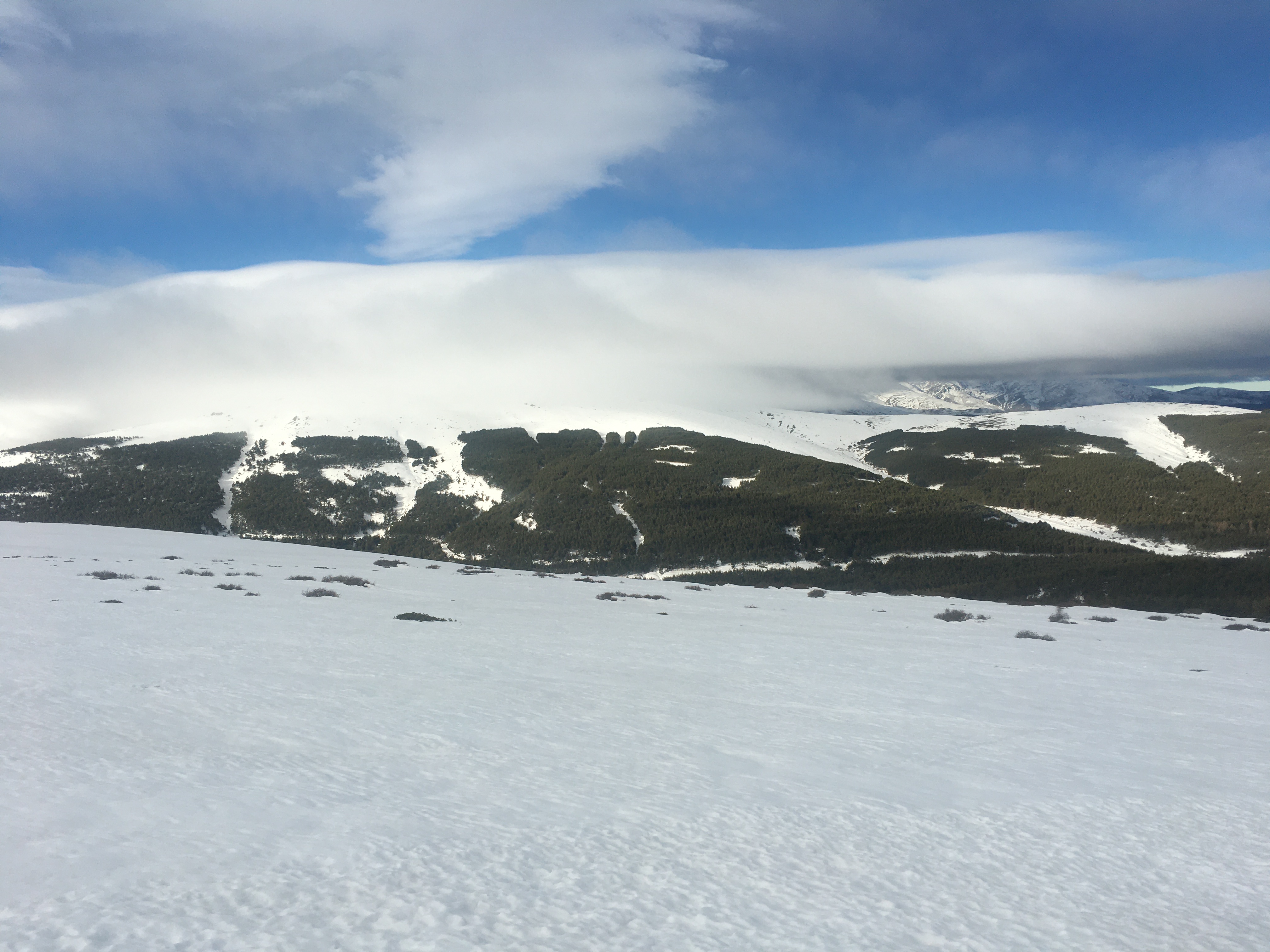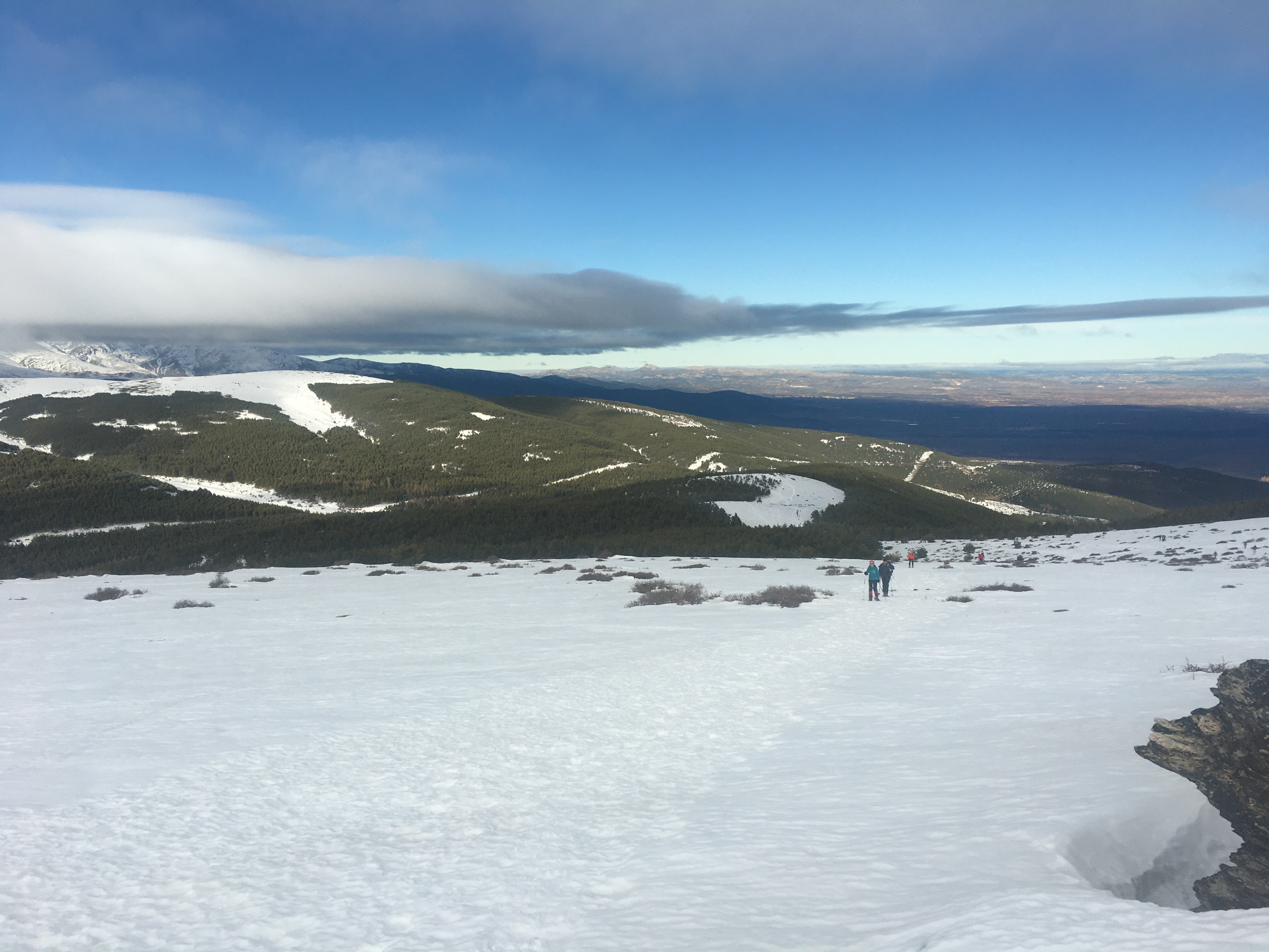 Bajamos por la misma ruta, pero tras pasar el refugio comenzó a despejarse el día y disfrutamos de unas buenas vistas de Sierra Nevada, Morrón Sanjuanero, Morrón del Mediodía y Picón de Jeres. Al salir el sol, la nieve transformó rápidamente y la bajada se hizo muy pesada.