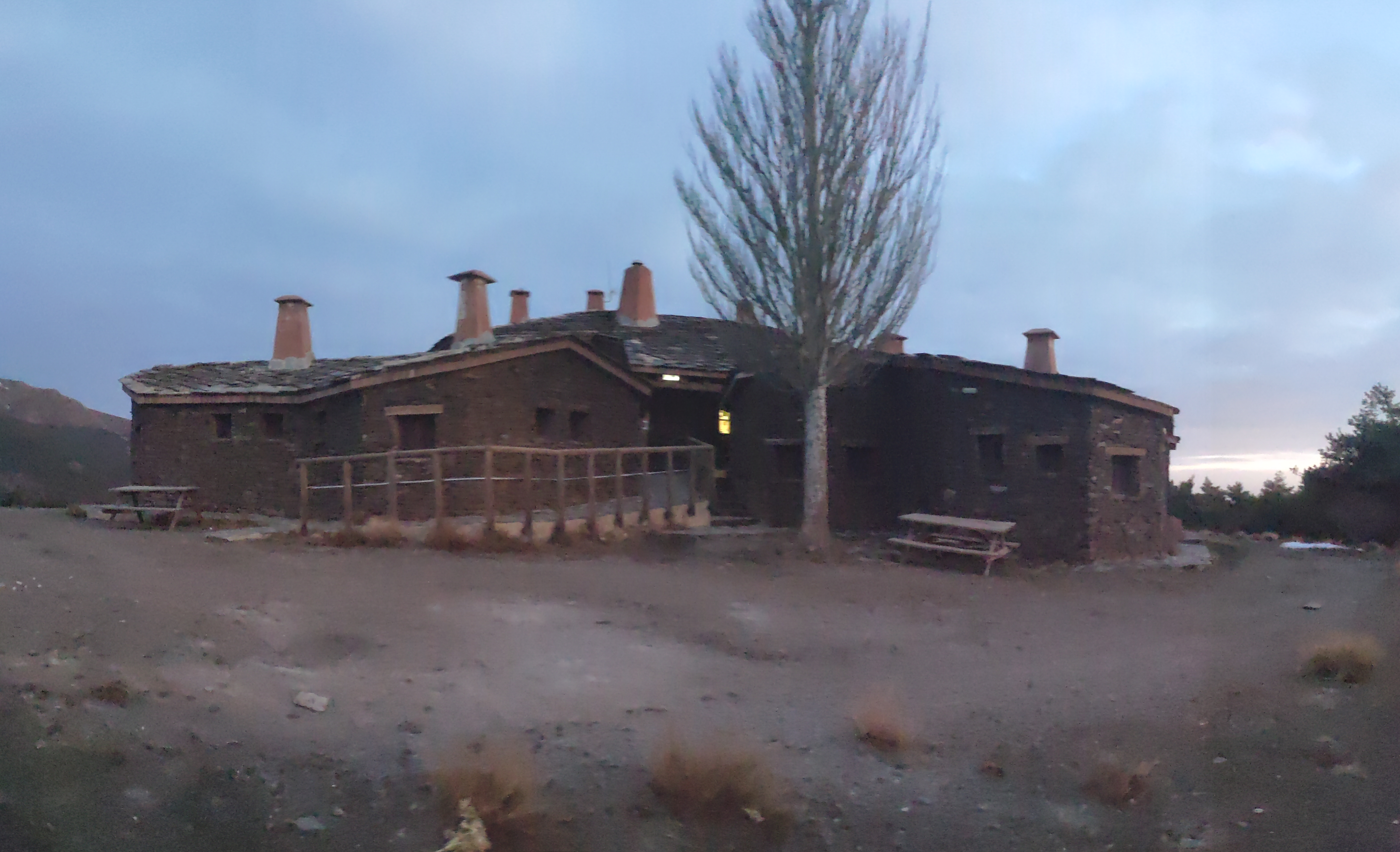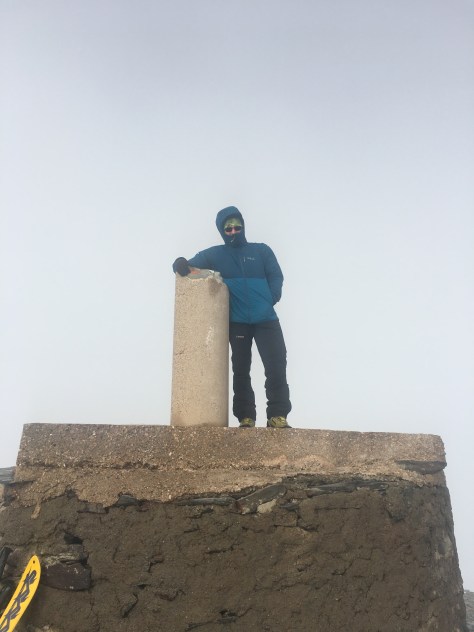 Al llegar a la zona del refugio, paramos para tomar algo y posteriormente continuamos hasta la cima. Al llegar nos recibió con niebla, fuerte viento y frío. Una foto rápida y a comenzar la bajada, ya que la situación no era la mejor para disfrutar de la cima.