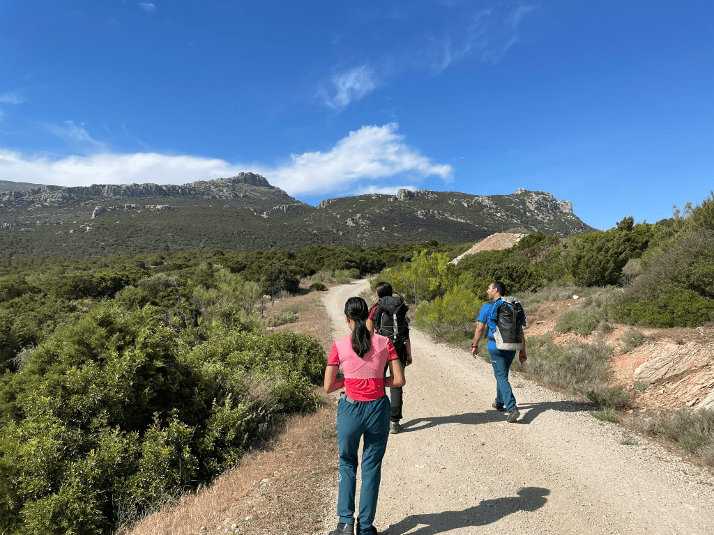 En la reanudación cogimos de bajada una senda hacia la derecha que nos llevaría a que la ruta fuera circular, una bajada con bastante piedra, algo resbaladiza y mucho matorral . Llegamos al cauce de un arroyo donde las pendientes ya se hicieron más suaves y a continuación cogimos la pista forestal que nos llevéis primero al área recreativa del Pinarillo… para después de 4 kilómetros más, llegar al punto de partida en la Cueva de Nerja.