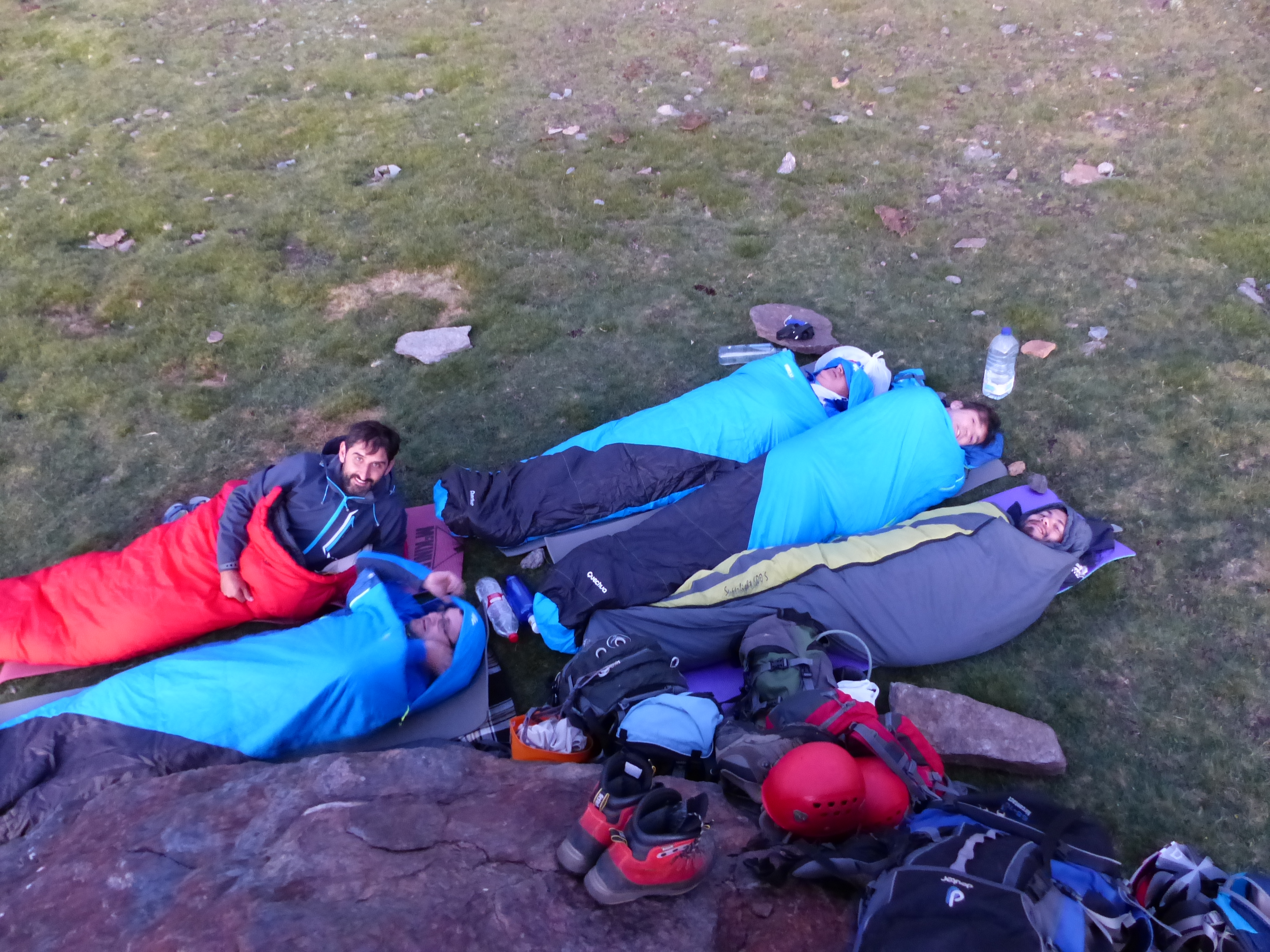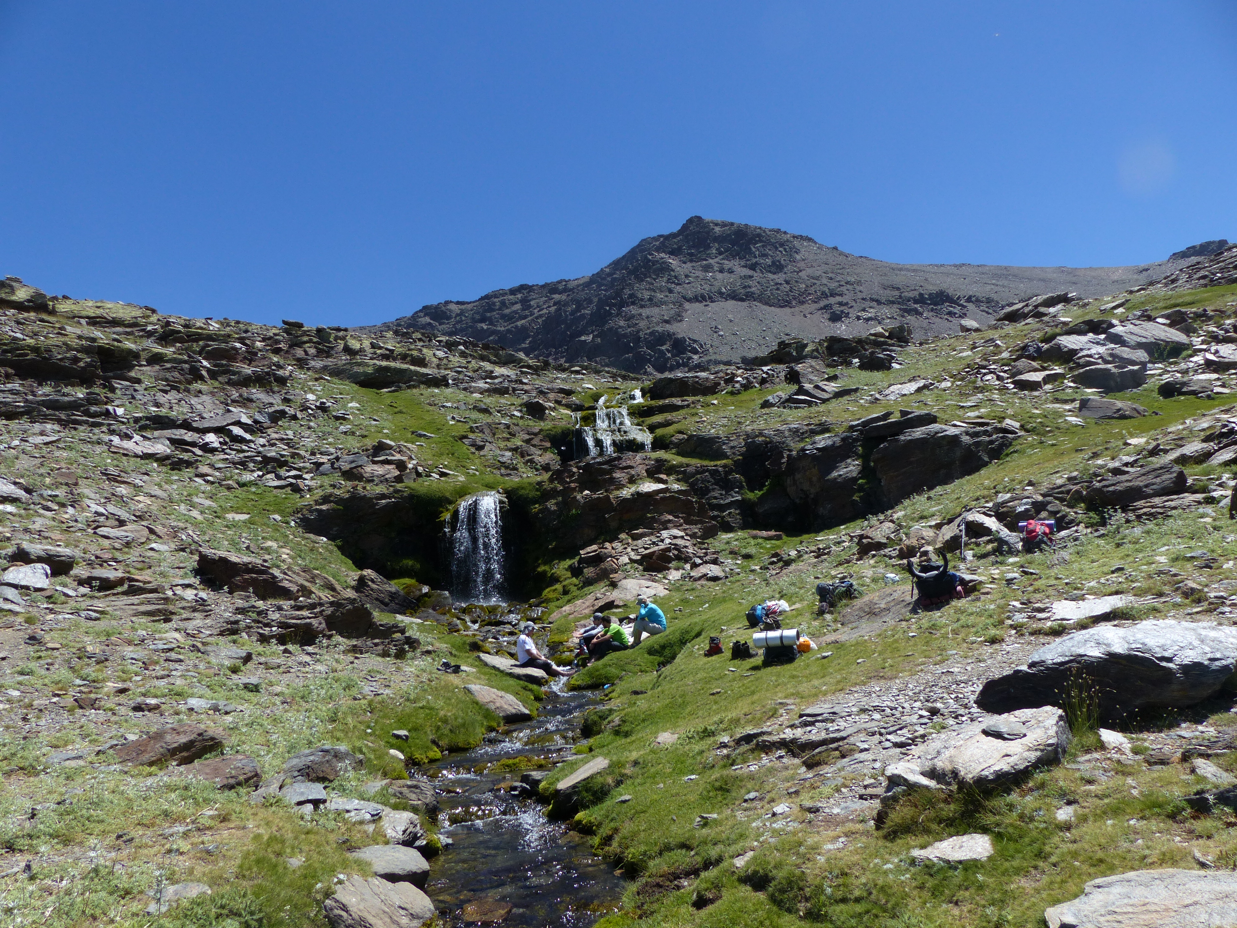 Descansando en los Lavaderos, con las cascadas de fondo.Descanso tras la comida.Cascadas de los Lavaderos.Campo Base (2.700 mts).