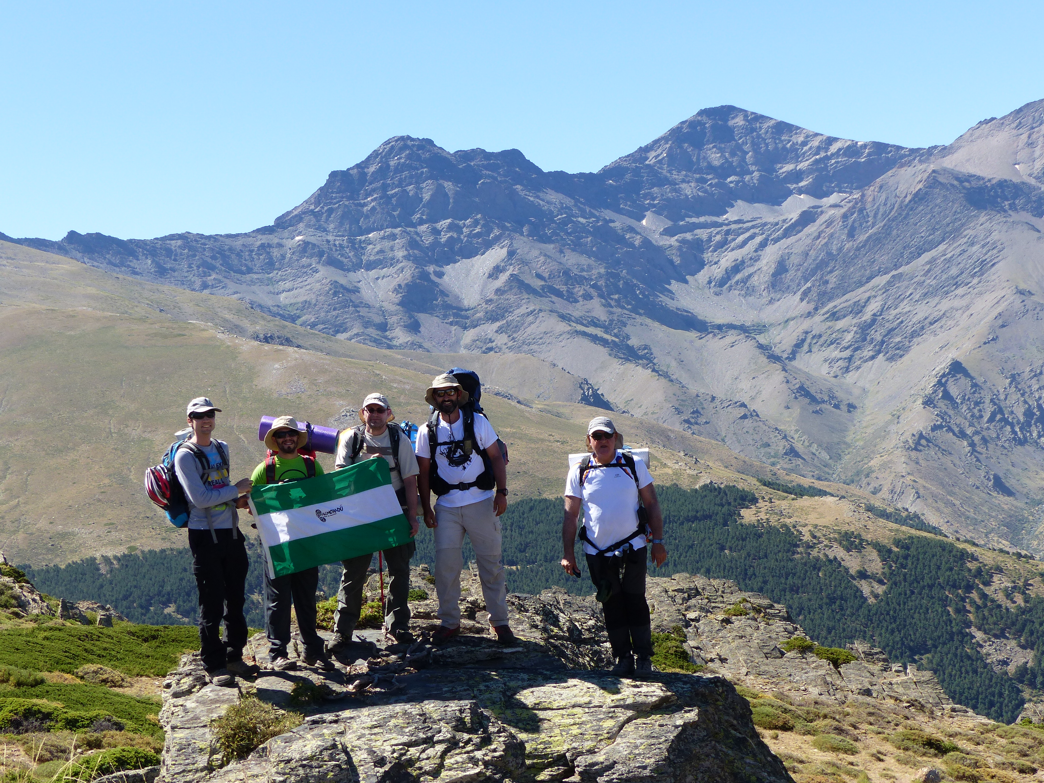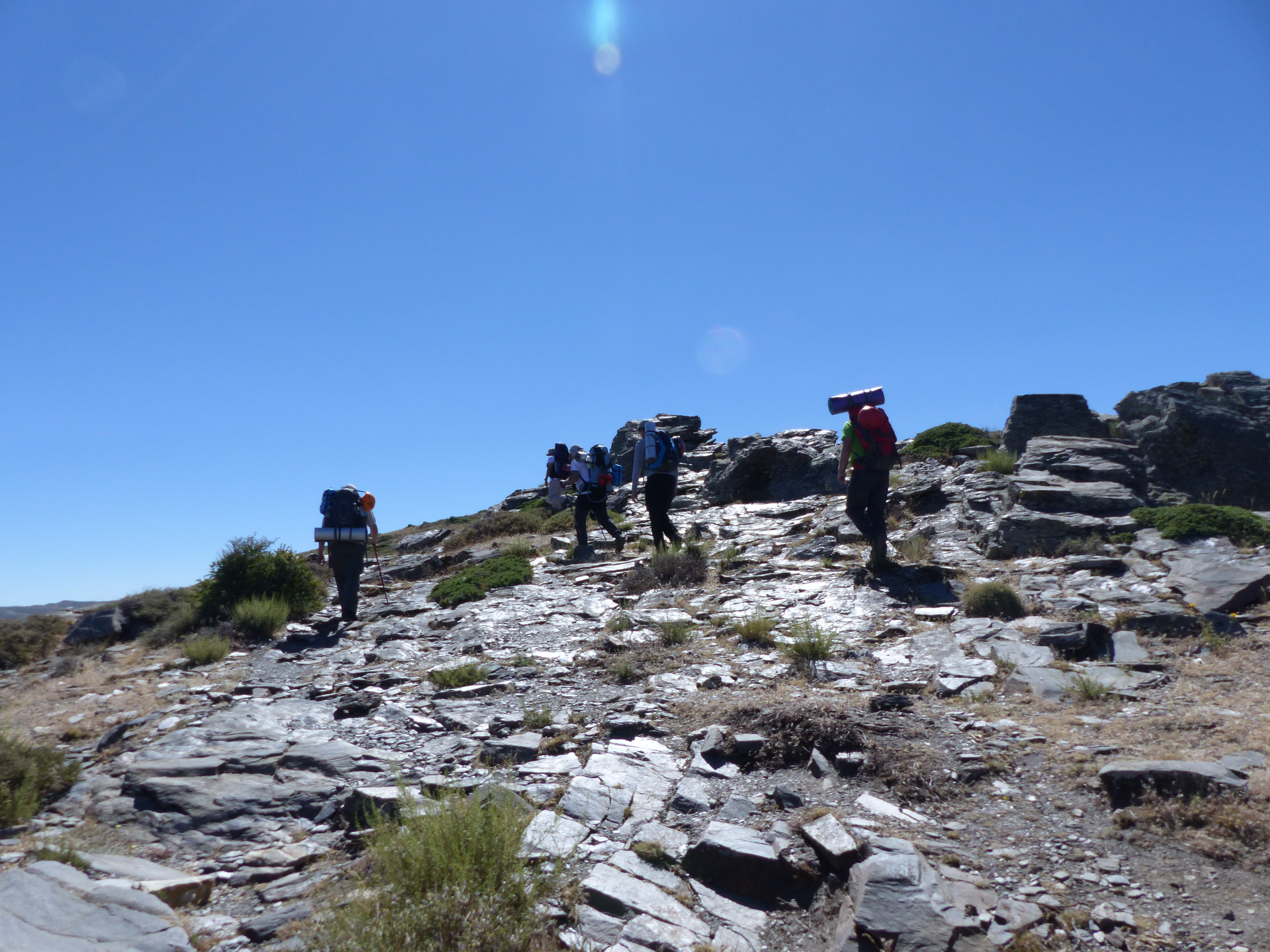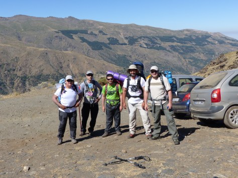 Partiendo de Fuengirola sobre las 7:00 h., nos dirigimos al pueblo granadino de Güejar Sierra, donde tras un desayuno, continuamos el camino hacia la cadena de la Loma de Papeles, lugar de inicio de la ruta. Tras unos 45 minutos de pista, llegamos a la cadena, preparamos y revisamos las mochilas y comenzamos a caminar, eran las 11:00 h. y el calor apretaba un poco, comenzamos unas primeras rampas para ir calentando, tras ir subiendo pegados a la acequia de Papeles, llegamos al vértice geodésico de Papeles (2.424 metros), foto del grupo y continuamos en dirección al Refugio de Peña Partida, tras una ligera bajada, llegamos al refugio, un pequeño descanso, tomamos algo de agua y continuamos el camino.