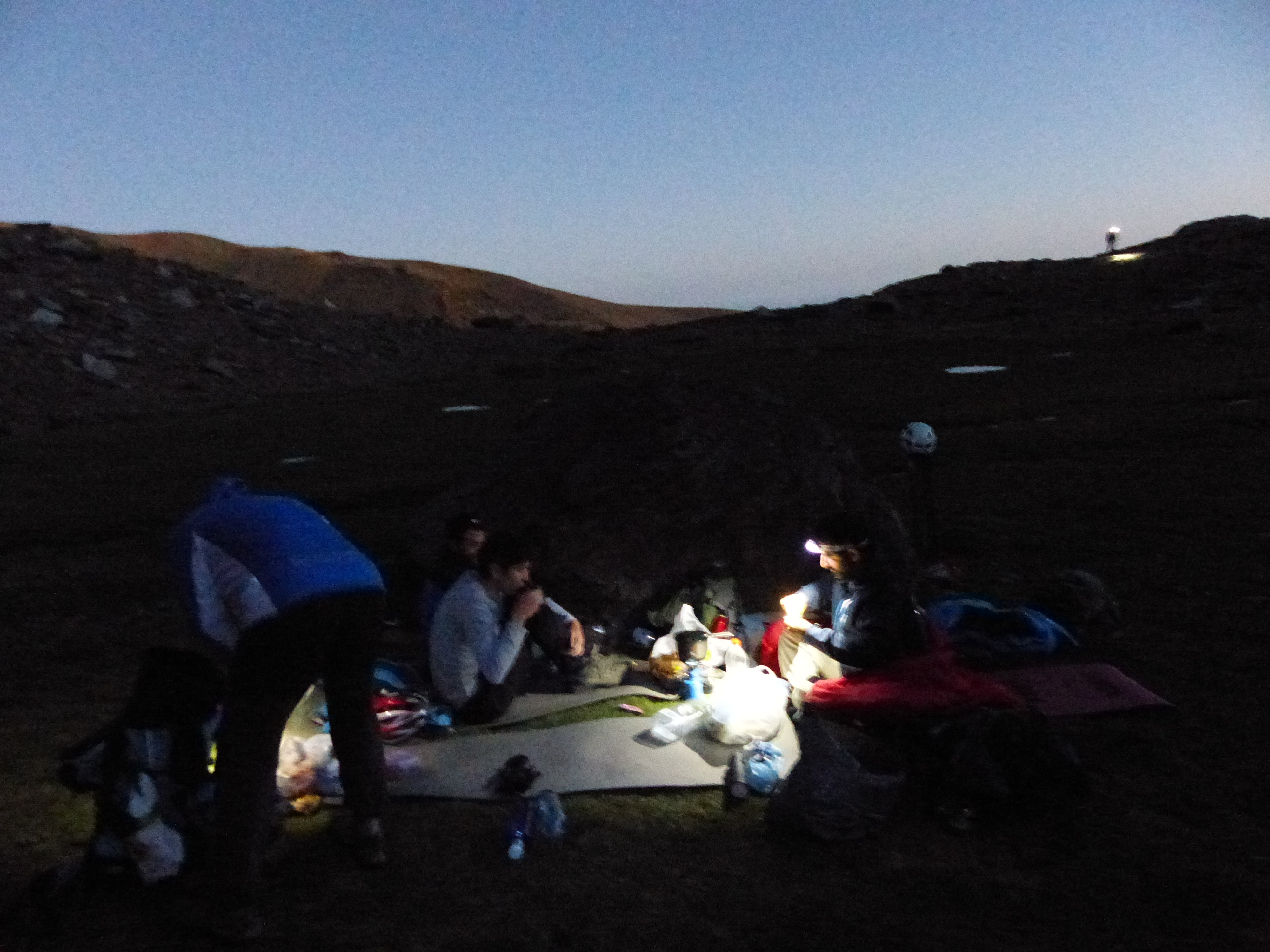 Descansando en el campo base.Cenando.Esperando la puesta de sol.Últimos rayos del día.