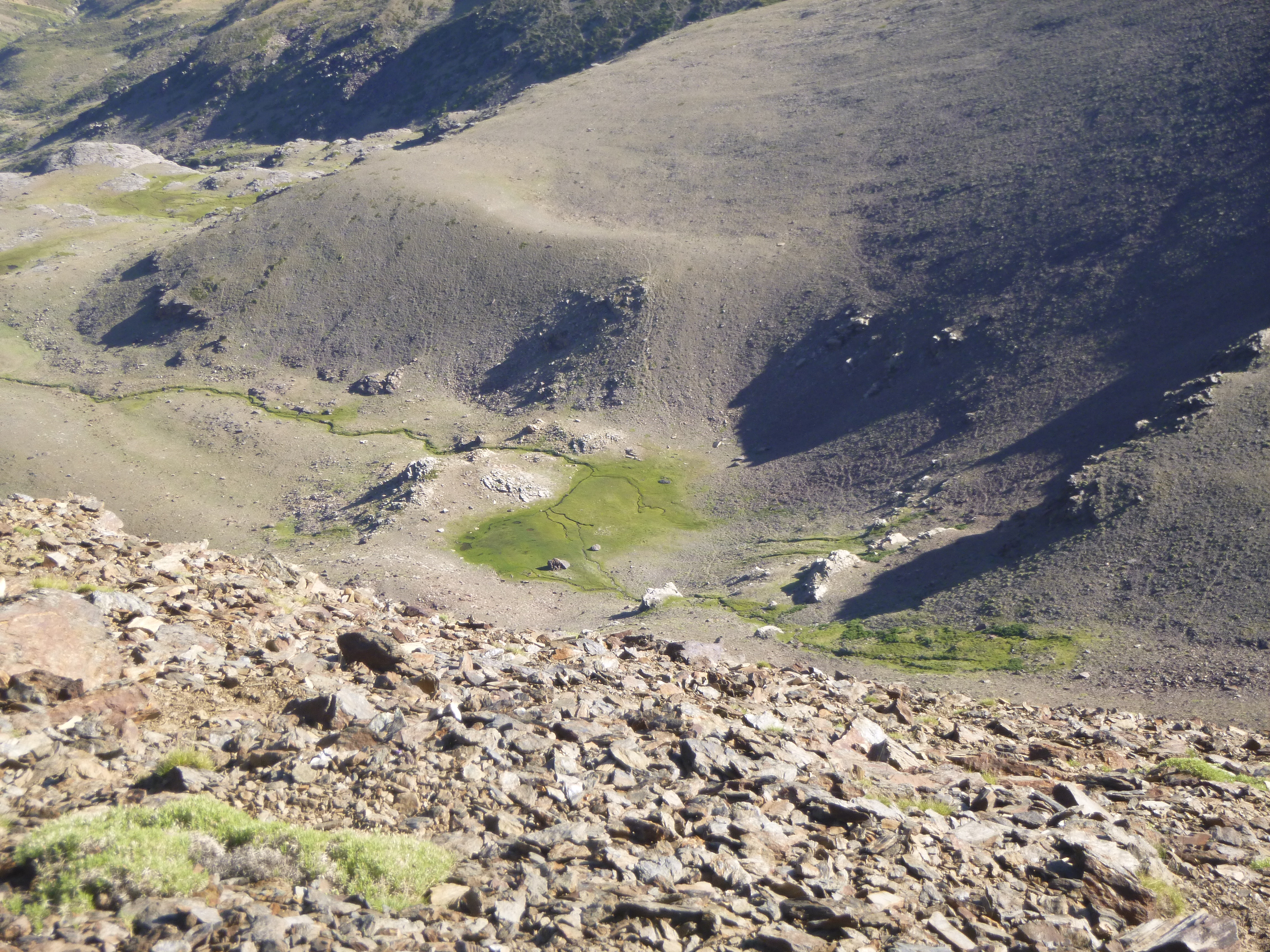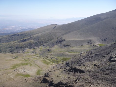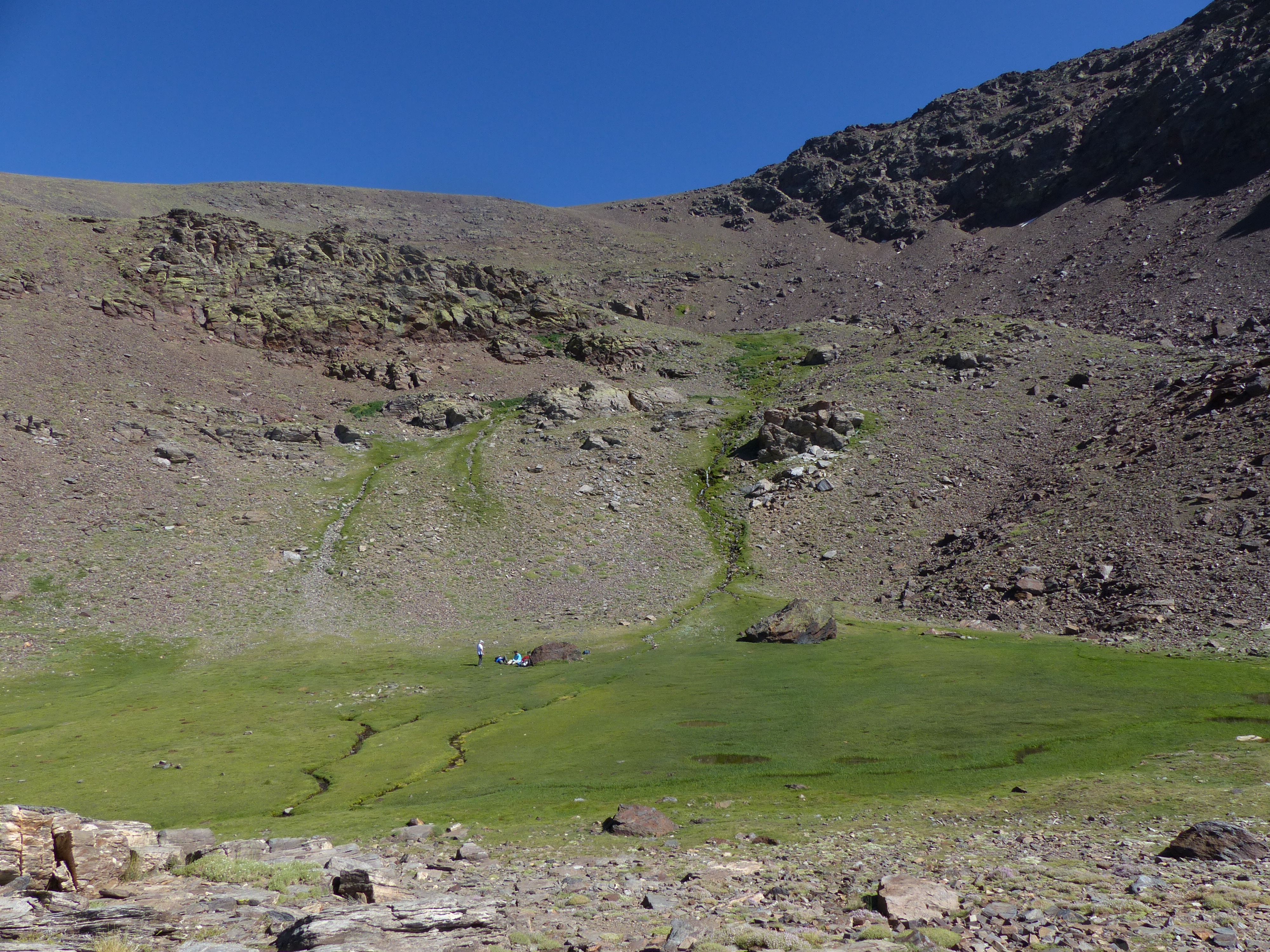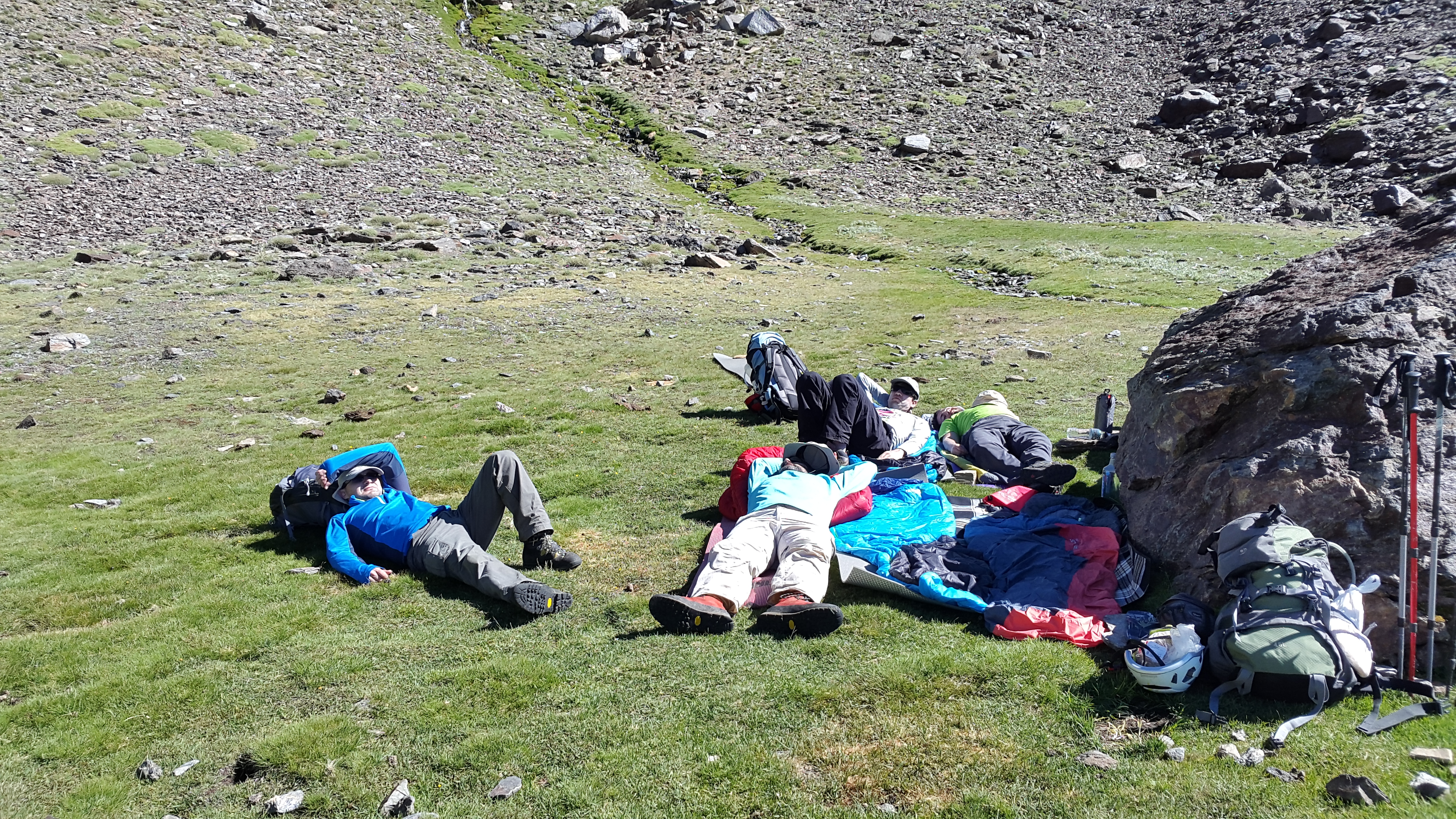 Tras decidir el lugar donde pasaríamos la noche, nos dimos un paseo por el lugar y estuvimos comentando la ruta que seguiríamos al día siguiente, intentando visualizar la manera más fácil de remontar la gran pared que teníamos sobre nuestras cabezas y que nos llevaría a la zona más elevada…. a las cumbres de Sierra Nevada, después estuvimos descansando e intentando evitar el fuerte sol y el calor que estaba haciendo, aún estando en altura.