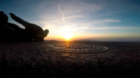 En el amanecer; en el mismo vértice geodésico hace acto de presencia un gato casero con ganas de mimo, lo cual lo hace si cabe más entrañable–.