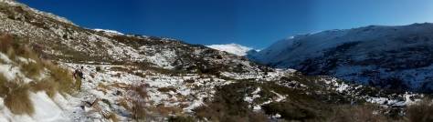 Para empezar la crónica de la salida a Sierra Nevada, programada para el fin de semana del 2 y 3 de febrero, comencemos por el principio de la semana, cuando todos los modelos meteorológicos daban una previsión de que un frente cruzaría y dejaría lluvia y nieve, fuertes vientos, pese a todo fue finalmente el jueves por la noche cuando ya dejamos previsto que intentaríamos hacer los previsto, aun cuando el viernes y el sábado aun tendríamos los efectos del frente. Quedamos finalmente a las 6 de la mañana en el Miramar de Fuengirola para salir hacia el pueblo de Lanjaron, donde comenzaríamos la ruta, tras llegar a Motril, la cosa no pintaba nada bien, durante la subida hacia Lanjaron comenzó a llover y podíamos ver como la zona de cumbres de la sierra estaba completamente cubierta de nubes. Tras aparcar y desayunar en el pueblo, aprovechamos una pequeña tregua, después de preparar todo el material, comenzamos la subida hacia el refugio de Tello, la ruta comienza desde el propio pueblo de Lanjaron, empezamos remontando una fuerte subida entre cortijos para poco a poco ir tomando altura por el barranco del río Lanjaron, durante esta parte nos comenzó a nevar y aunque estábamos a resguardo de los fuerte vientos que azotaban las cumbres, el aire también se dejaba notar.