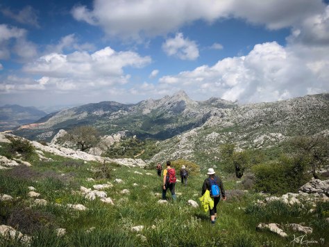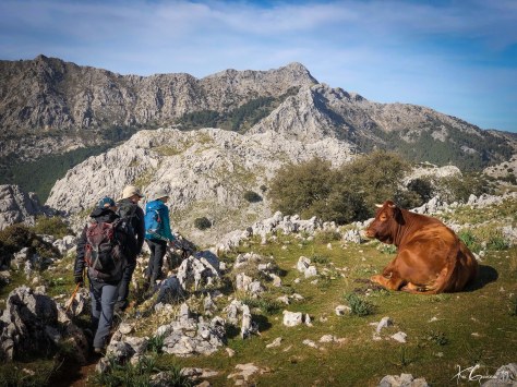 El Cortijo Dornajo es uno de los grandes cortijos de esta sierra, ya apenas conserva dos pared en pie, pero en sus piedras se adivina e imagina el montón de historias vividas en él. Seguimos ascendiendo ya dirección Norte, a nuestra derecha vemos las cumbres del Simancón y Reloj que en un principio era un objetivo a conquistar pero el grupo valoró el cansancio de los miembros debido a la longitud de la ruta y al fuerte viento racheado que todavía reina en la zona. Subimos de nuevo hasta el Puerto de Las Presillas una vez en el cruce decidimos bajar hacia el pueblo de Grazalema en vez de dirigirnos al Puerto del Boyar de donde partimos, una bajada pasando por los “Llanos del Endrinal” un precioso lugar que nos llevará al final de nuestra ruta.
