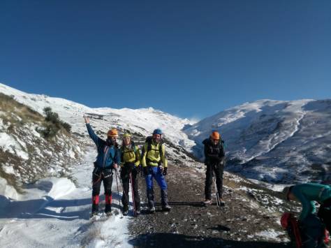 Tras una noche agradable, madrugamos y nos encontramos que la situación no había remitido aún, y que continuaba el fuerte viento, así que nos quedamos en el saco, ya al amanecer y desayunar comprobamos que el viento por fin paraba y aunque tarde decidimos adentrarnos hacia las cumbres e intentar subir a Peña Caballera, consiguiendo llegar y después nos colocamos los crampones para descender por una gran pala de nieve, continuar por la senda y regresar al refugio y tras una pequeña para continuar el descenso y llegar a Lanjaron. Un gran fin de semana aunque la montaña no nos dejase hacer lo que teníamos previsto en un principio, pero la seguridad es lo más importante y las montañas siempre estarán hay esperándonos.