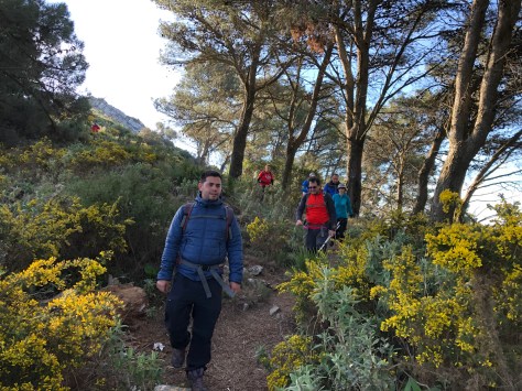 El pasado 2 de marzo ocho socios del club realizamos una ruta por la Sierra de Mijas, en principio se planeó hacer una pequeña circular entre la Cantera de los Arenales por la Cañada del Nacimiento. Esta ruta se vio ampliada por otra más ambiciosa que nos llevaría desde la Cañada Don Pedro donde partimos hacia las 8h15m, subiendo en paralelo por la Cañada de Los Helechos. En 45 minutos estábamos en el Puerto del Cerezal (783m), una buena subida que se vio dificultada por el viento moderado de Terral. Ahora decidimos subir hacia el Puerto de las Tres Caleras para alcanzar en dirección Sur el Cabezo de Zagarrulera (887 m) un alto que vemos desde la costa en forma de pirámide. Continuamos nuestra ruta por la Crestería Norte y una vez pasado el Puerto de La Breña en pocos metros alcanzamos el Pico Cornicalejos (919m), un precioso lugar donde las vistas son impresionantes. De ahí bajamos dirección Norte por el Puerto del Farero para hacer una pequeña crestería. Volvemos hacia nuestros pasos para dirigirnos al Puerto de la Media Luna (817m), seguimos la pista hasta llegar al Puerto de La Graja (El Pino), cruce de caminos que está a 747 m, aprovechamos para tomar algo de fruta y continuar nuestro camino. Es ahora cuando empezamos la ruta en un principio planificada, adentrándonos por un precioso bosque de coscojas con vistas al Valle del Guadalhorce. Continuamos por la pista de Los Arenales para coger un sendero entre pinares que en esta época suelo estar muy húmedo pero que debido al seco invierno dejó más polvo que otra cosa.