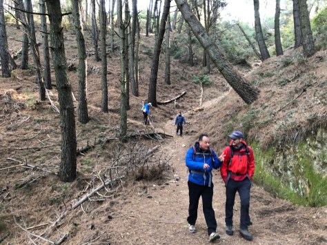 En la reanudación cogimos de bajada una senda hacia la derecha que nos llevaría a que la ruta fuera circular, una bajada con bastante piedra, algo resbaladiza y mucho matorral . Llegamos al cauce de un arroyo donde las pendientes ya se hicieron más suaves y a continuación cogimos la pista forestal que nos llevéis primero al área recreativa del Pinarillo… para después de 4 kilómetros más, llegar al punto de partida en la Cueva de Nerja.