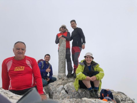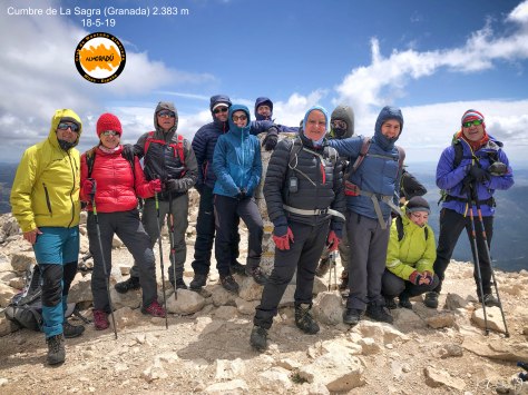 Aquí en el collado las vistas son impresionantes, al norte la Sierra de Cazorla y al sur la Hoya de Baza, el viento del Oeste empieza a soplar con cierta intensidad así que echamos mano del cortaviento para afrontar la segunda mitad de la ascensión. Una ascensión agreste donde apenas existe vegetación, tan solo algún que otro pino con forma muy irregular adaptado a la exigencia de la alta montaña. Atrás vemos un horizonte que parece curvarse, delante nuestra y tras 3h45m de subida con 8 km 500 m de distancia desde el inicio, ya vemos la cumbre de la Sagra (2.383m). El grupo llega compacto a la cumbre donde nos hacemos la foto de rigor con un viento constante y frío, calculo que sopló a unos 40 a 45 km/h con una temperatura aproximada de 1 o 2 grados, con lo que la sensación térmica debió de ser de unos -5 grados.