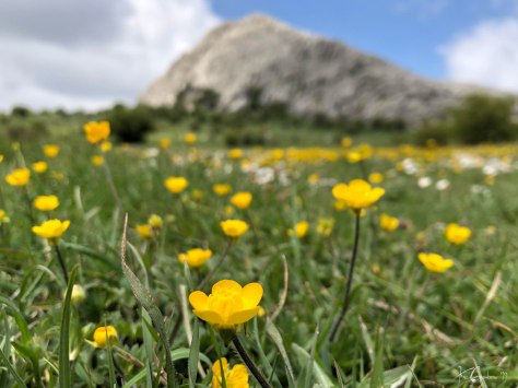 Pasamos por el nacimiento del río Guadalmedina que nace en una vaguada que parte de los pies del Pico Camarolo. Antes de llegar a nuestra segunda cumbre del día visitamos un viejo nevero que se conserva en buenas condiciones pese al paso de los años. La ascensión a la Cruz de Camarolo es técnicamente fácil, no hay ninguna vereda es una subida por piedras de grandes dimensiones. Tras 5 horas de caminata y unos 10 kilometros desde el inicio llegamos a la cumbre, el tiempo nos acompaña, temperatura suave y los cielos con intervalos nubosos. Desde aquí podemos observar con bastante claridad toda la ruta que estamos realizando con unas vistas del Chamizo únicas. Aprovechamos para almorzar y tras 30 minutos de merecido descanso iniciamos el descenso que nos llevará de nuevo a los Llanos del Hondonero, un descenso entre un espeso bosque de encinas y frondoso matorral, es aquí en este último tramo de la ruta donde el paisaje se parece más a un cuadro impresionista de Monet o Van Gogh, un verde manto donde florecen amapolas, linarias y de nuevo las orquídeas. Antes de terminar nuestra ruta nos queda pasar por otro de los iconos de esta ruta, el Tajo de la Madera, una impresionante mole de piedra que es el disfrute de todo aficionado a la escalada. Tras casi 8 horas de ruta y un total de 13,800 Km terminamos bastantes satisfechos por lo realizado y sobre todo por la sintonía que ha reinado en el grupo.